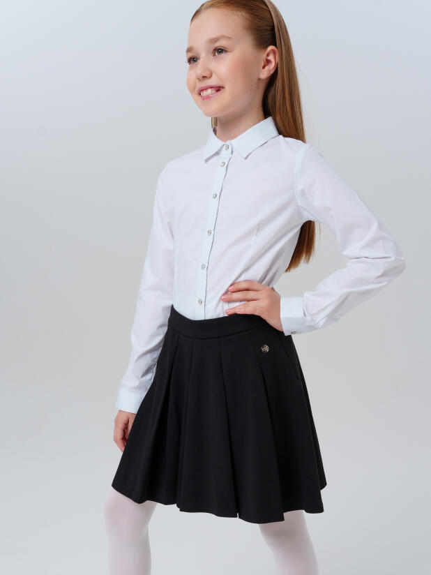 Мягкий трикотажный материал приятен к телу и хорошо тянется, позволяя чувствовать себя уверенно в течение всего дня. Стильная школьная юбка для подростков легко комбинируется с рубашками, водолазками, жилетами и пиджаками из школьной коллекции бренда — получится собранный и удобный образ.