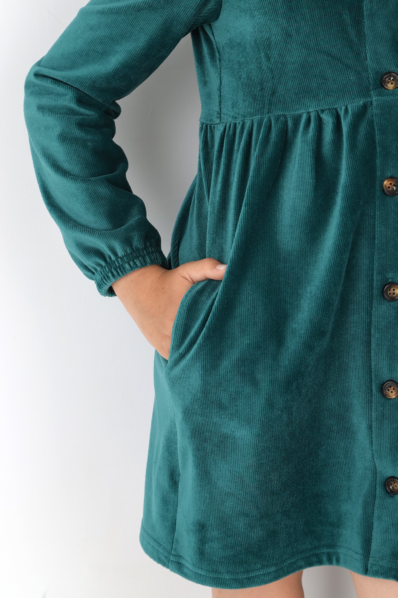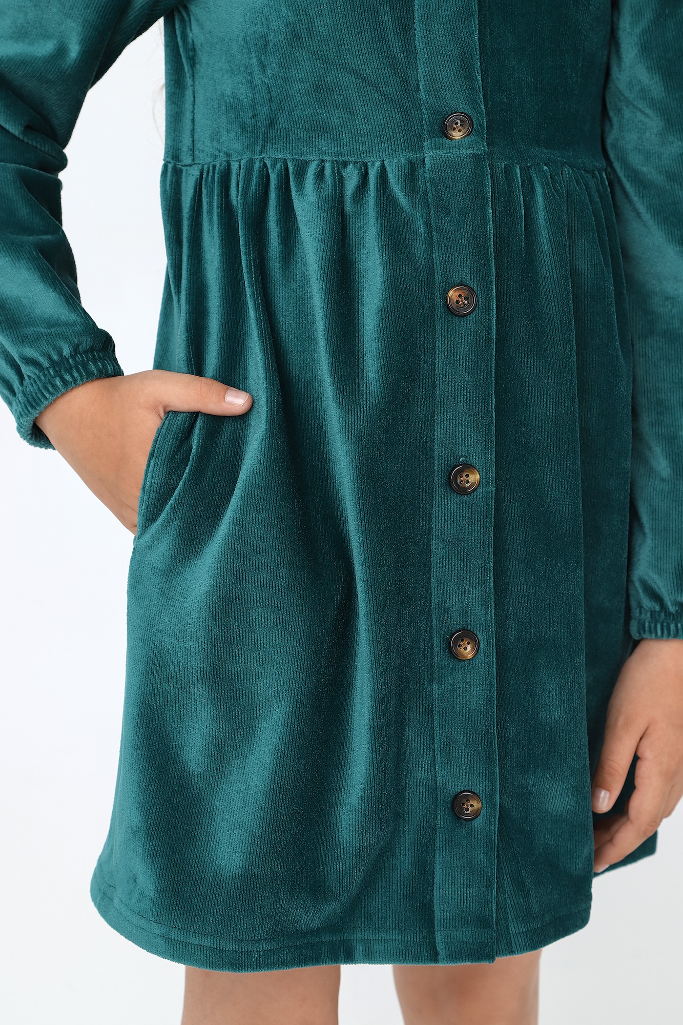Актуальное платье для девочки, из трикотажного вельвета. Модель с застёжкой на пуговицы, с отложным воротником, отрезной "юбкой" на сборке, карманами в боковых швах. Рукава по низу собраны на эластичную тесьму. Отличный выбор для девочек разных возрастов.