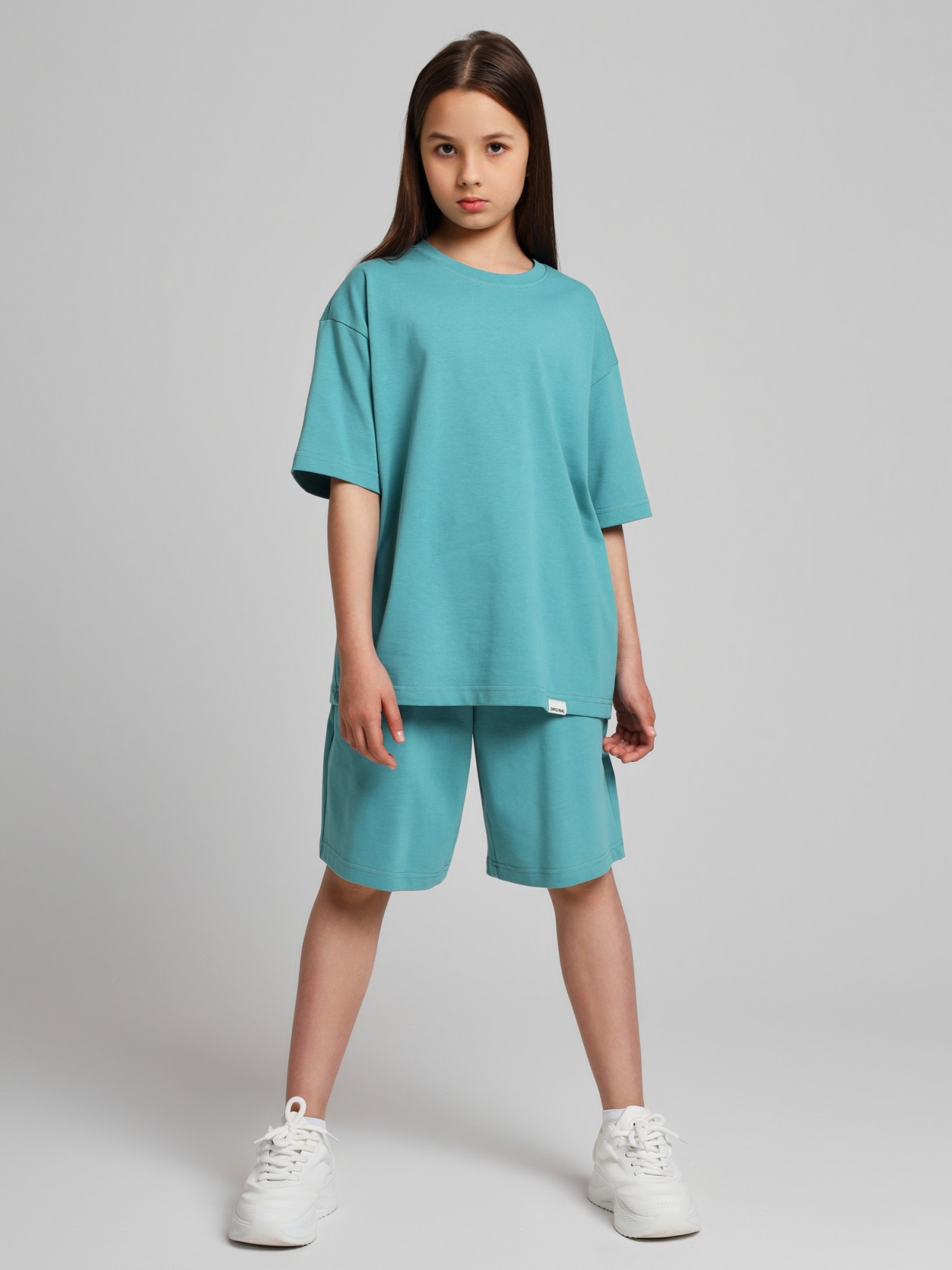 Костюм для девочки из плотного гладкокрашеного трикотажного полотна "кулирка", состоящий из футболки и шорт. Футболка - свободного покроя, с удлиненными плечевым и швами, короткими втачными рукавами и горловиной овальной формы, обработанной втачной планкой. В нижней части переда слева настрочен декоративный элемент прямоугольной формы. По горловине проложена отделочная строчка. Шорты - классического покроя, на притачном поясе с эластичной тесьмой внутри и карманами в боковых швах. Для регулирования степени прилегания шорт по талии в пояс вставлен шнурок, продетый через два отверстия в соединительных швах в центре пояса.