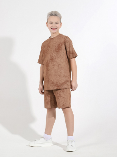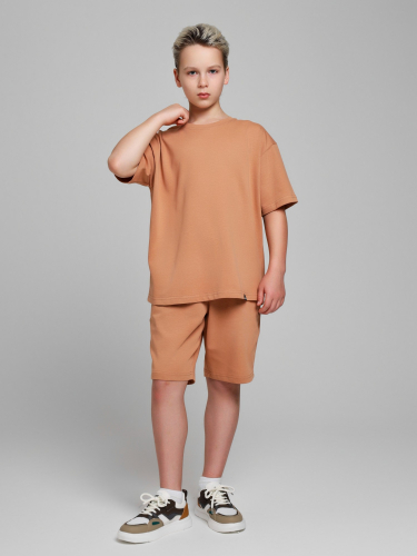 Костюмдля мальчика из плотного гладкокрашеного трикотажного полотна "кулирка", состоящий из футболки и шорт. Футболка - свободного покроя, с удлиненными плечевым и швами, короткими втачными рукавами и горловиной овальной формы, обработанной втачной планкой. В нижней части переда слева настрочен декоративный элемент прямоугольной формы. По горловине проложена отделочная строчка. Шорты - классического покроя, на притачном поясе с эластичной тесьмой внутри и карманами в боковых швах. Для регулирования степени прилегания шорт по талии в пояс вставлен шнурок, продетый через две петли в центре пояса.