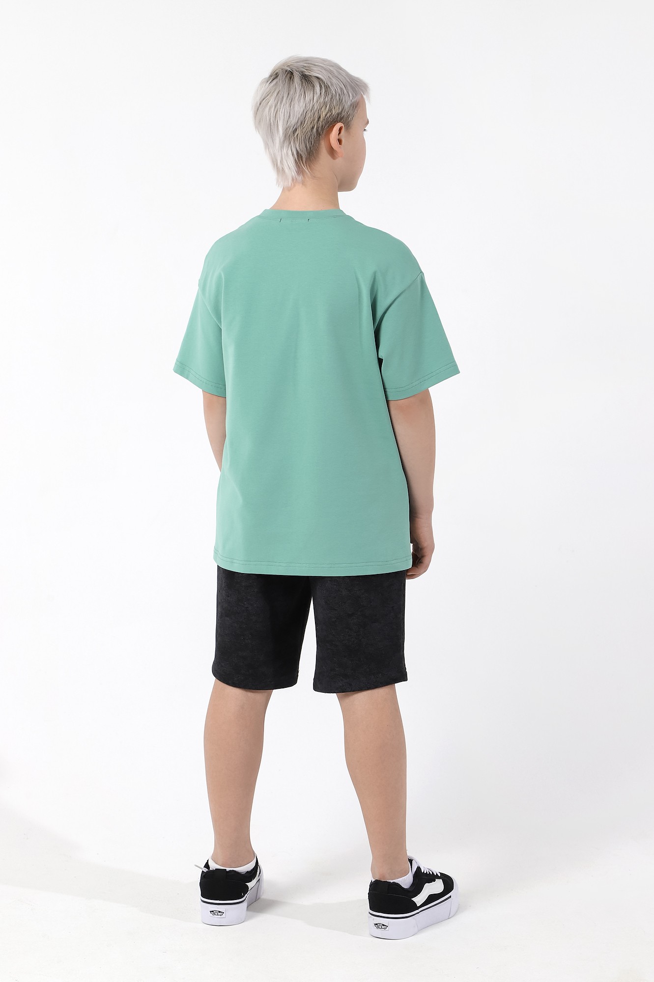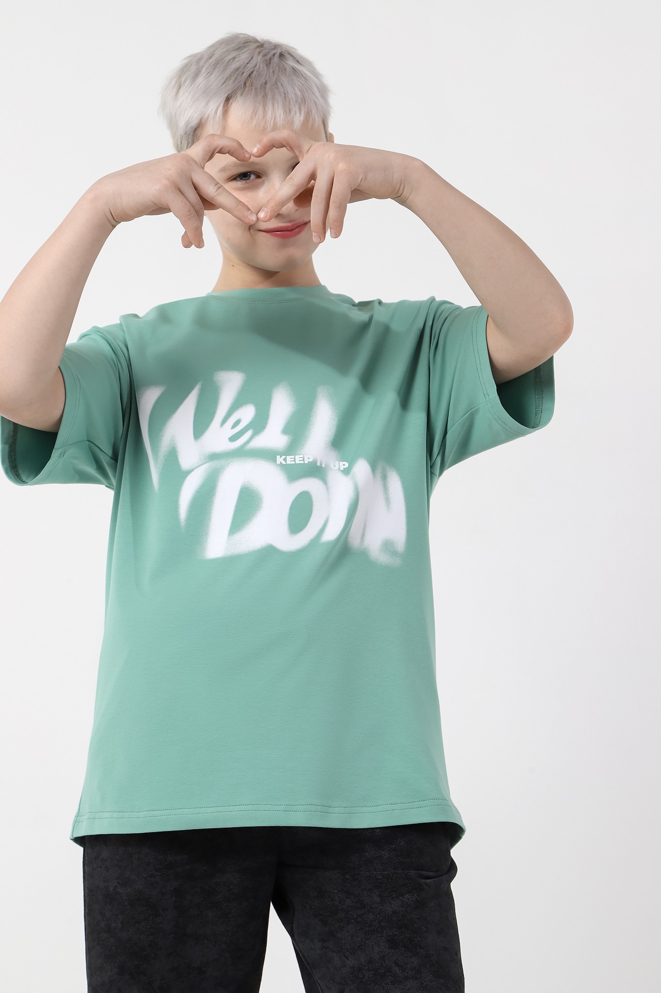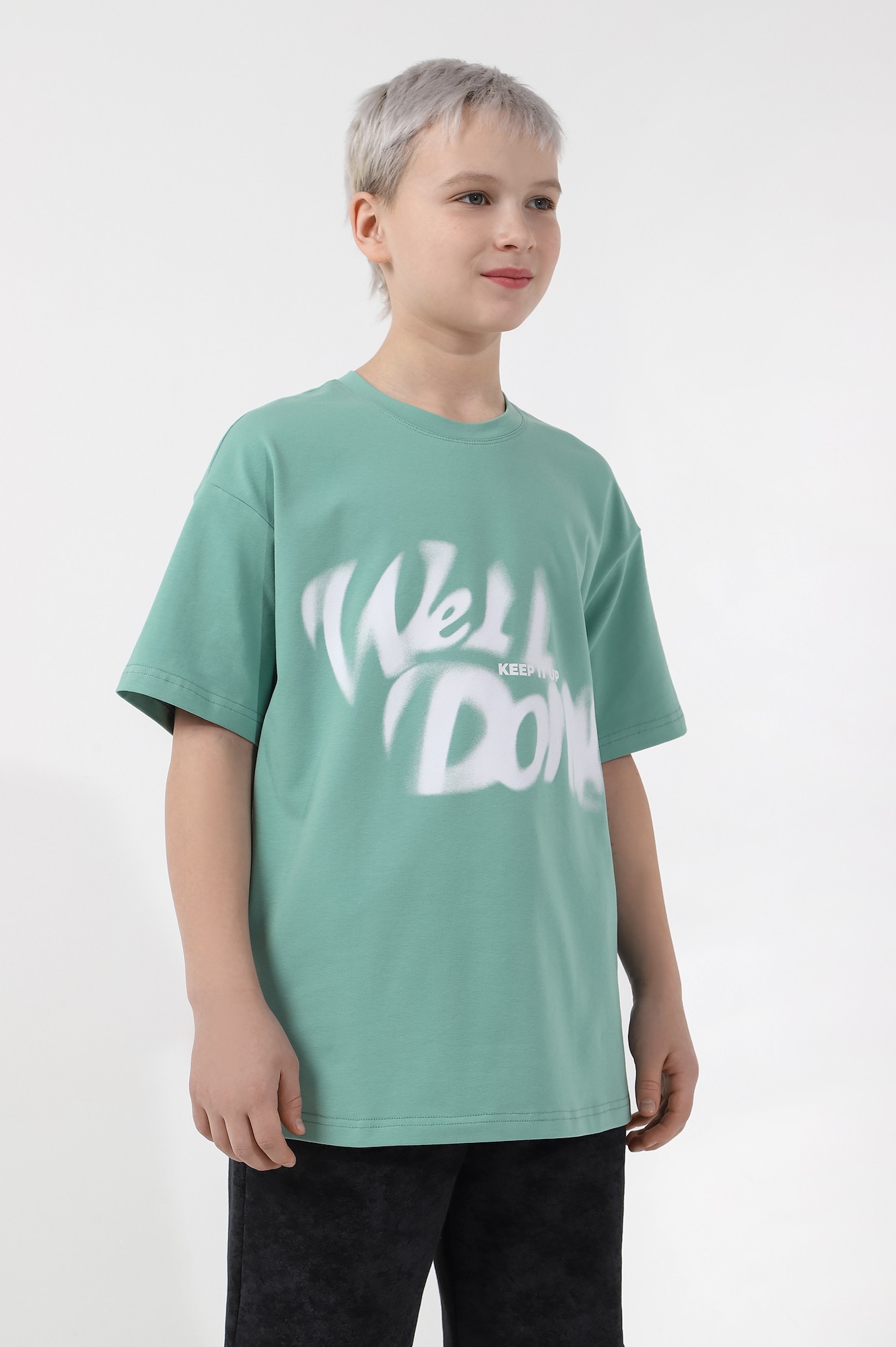 Футболка оверсайз для мальчика из трикотажного полотна: хлопкового с добавлением лайкры. Модель с принтом на переде, спущенной линией плеч, рукавами длиной до локтя.