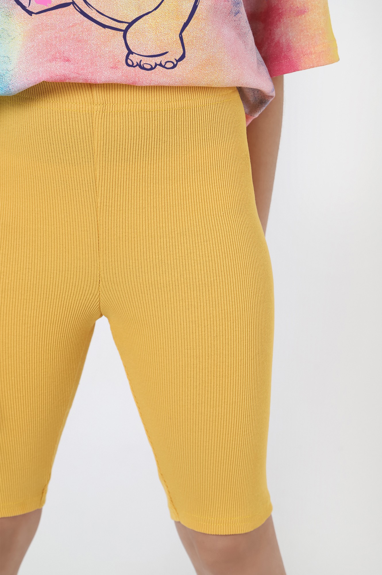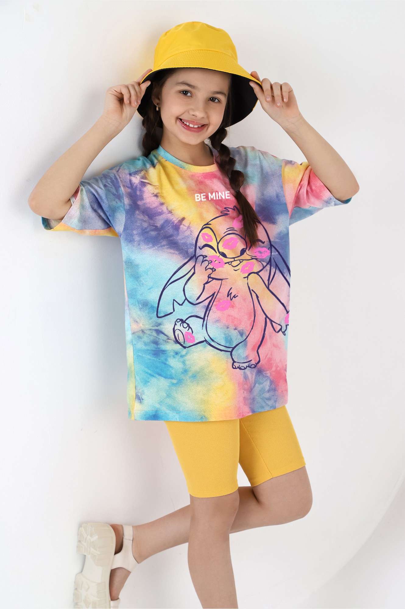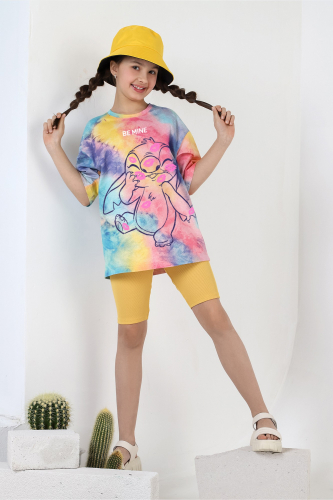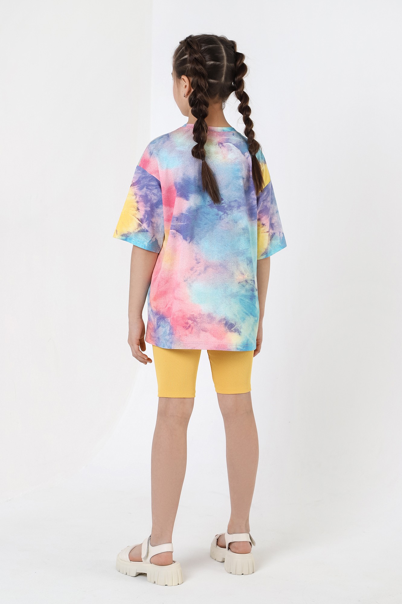Модный и комфортный костюм для девочки. Футболка из гладкокрашеного трикотажного полотна "кулирка", свободная, удлиненная, со спущенной линией плеч и с ярким принтом на полочке. Бриджи - велосипедки из полотна "кашкорсе", плотно прилегающие к телу, длиной выше колен