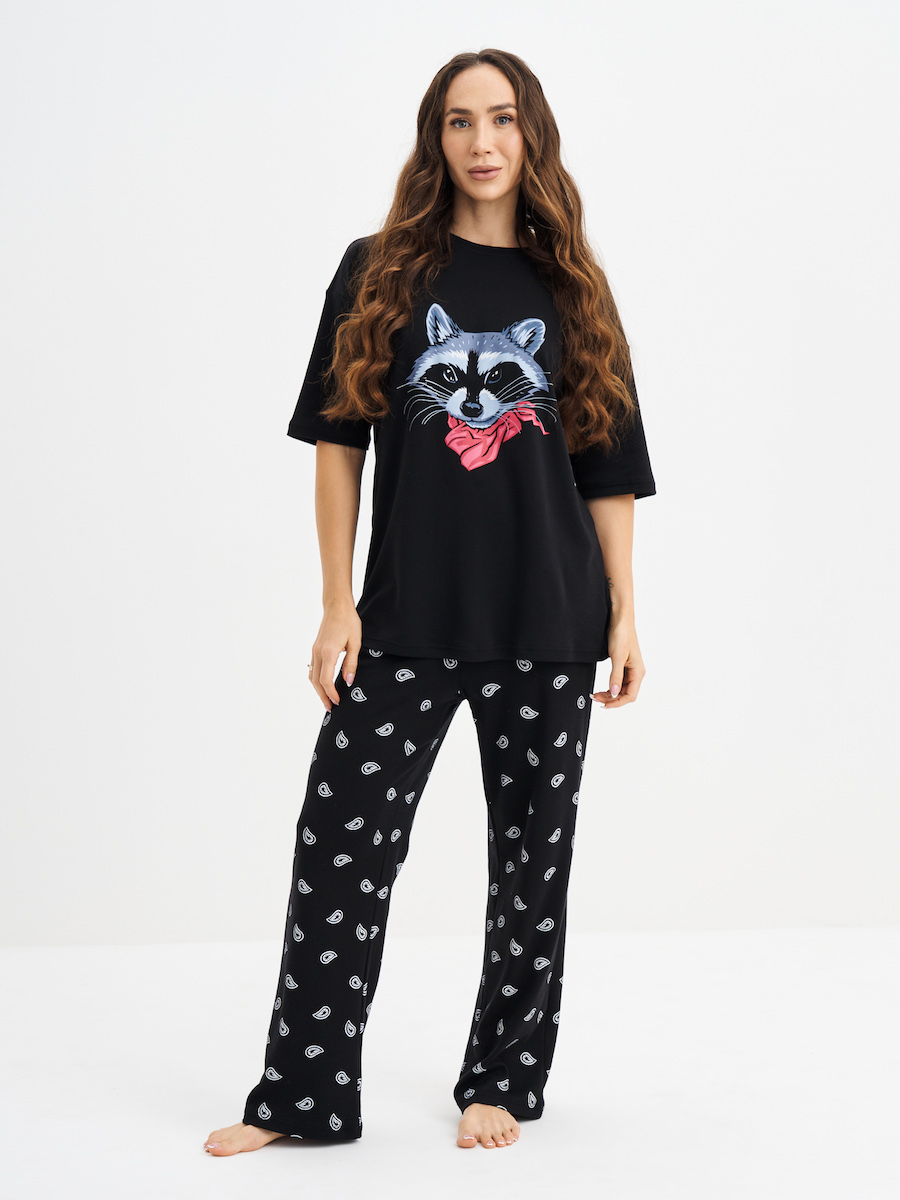 Пижама женская "енот" с футболкой и широкими брюками с карманами из интерлока