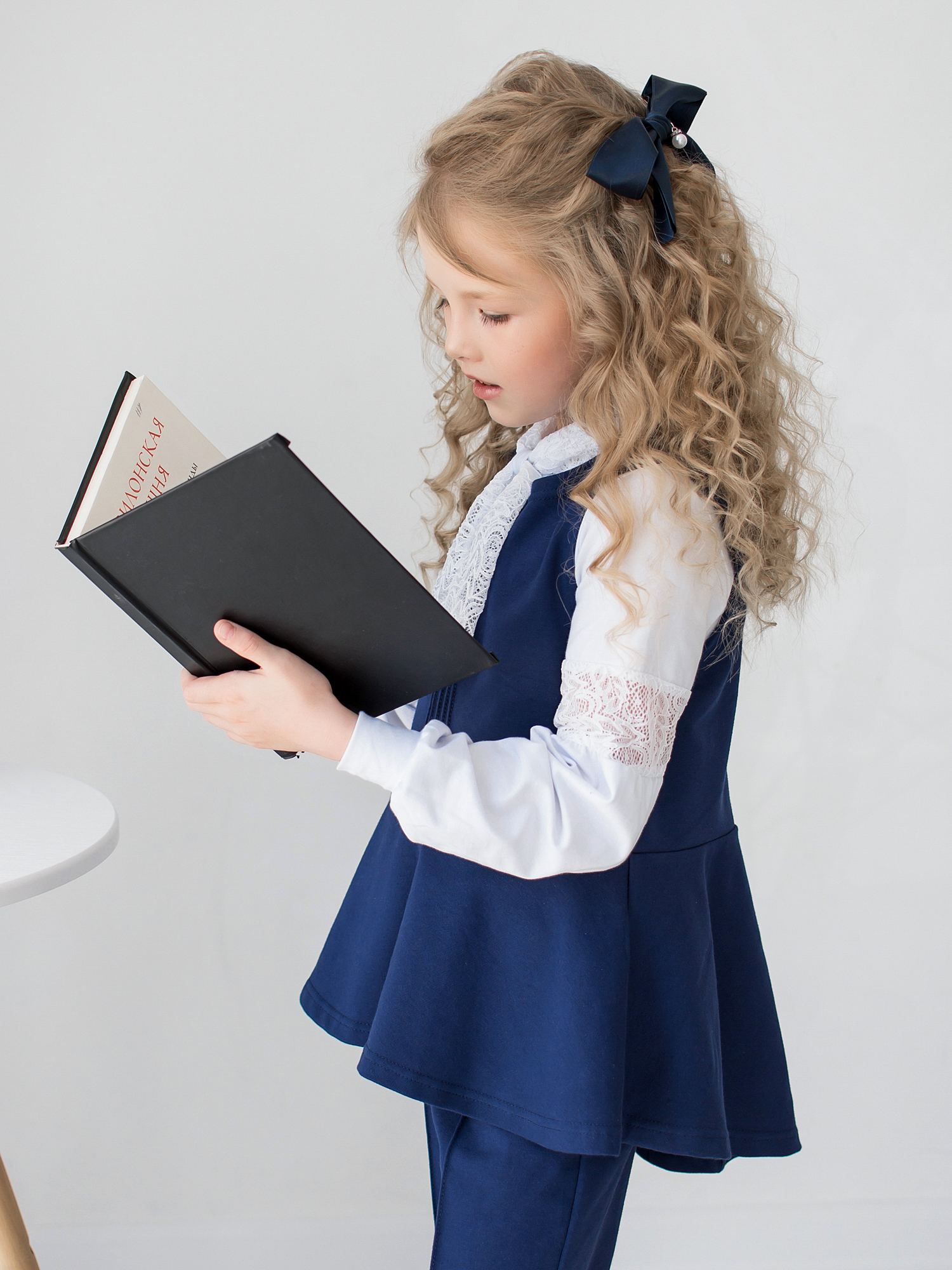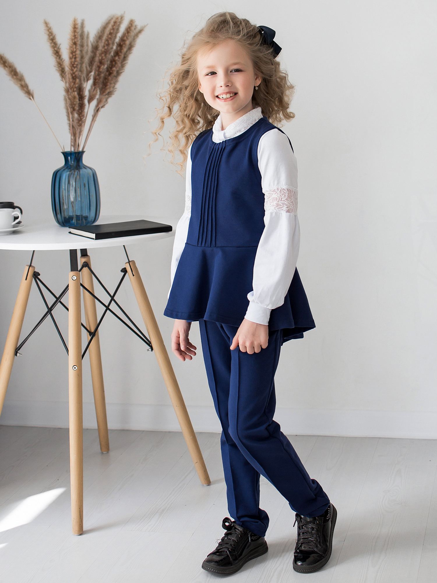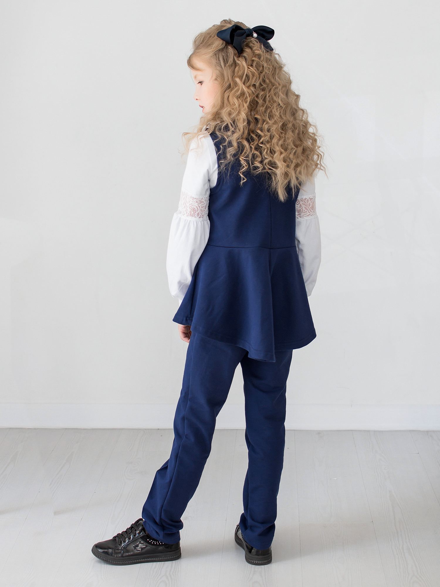 Жилет школьный из футера синего(индиго) цвета для девочки , отрезной по линии талии, с расклешенной баской. Баска с асимметричной линией низа, немного удлиненная сзади. Спереди по центру - отделка в виде пяти вертикальных строчек. Изделие выполнено из трикотажа премиального качества - ПЕНЬЕ, с содержанием хлопка более 92%