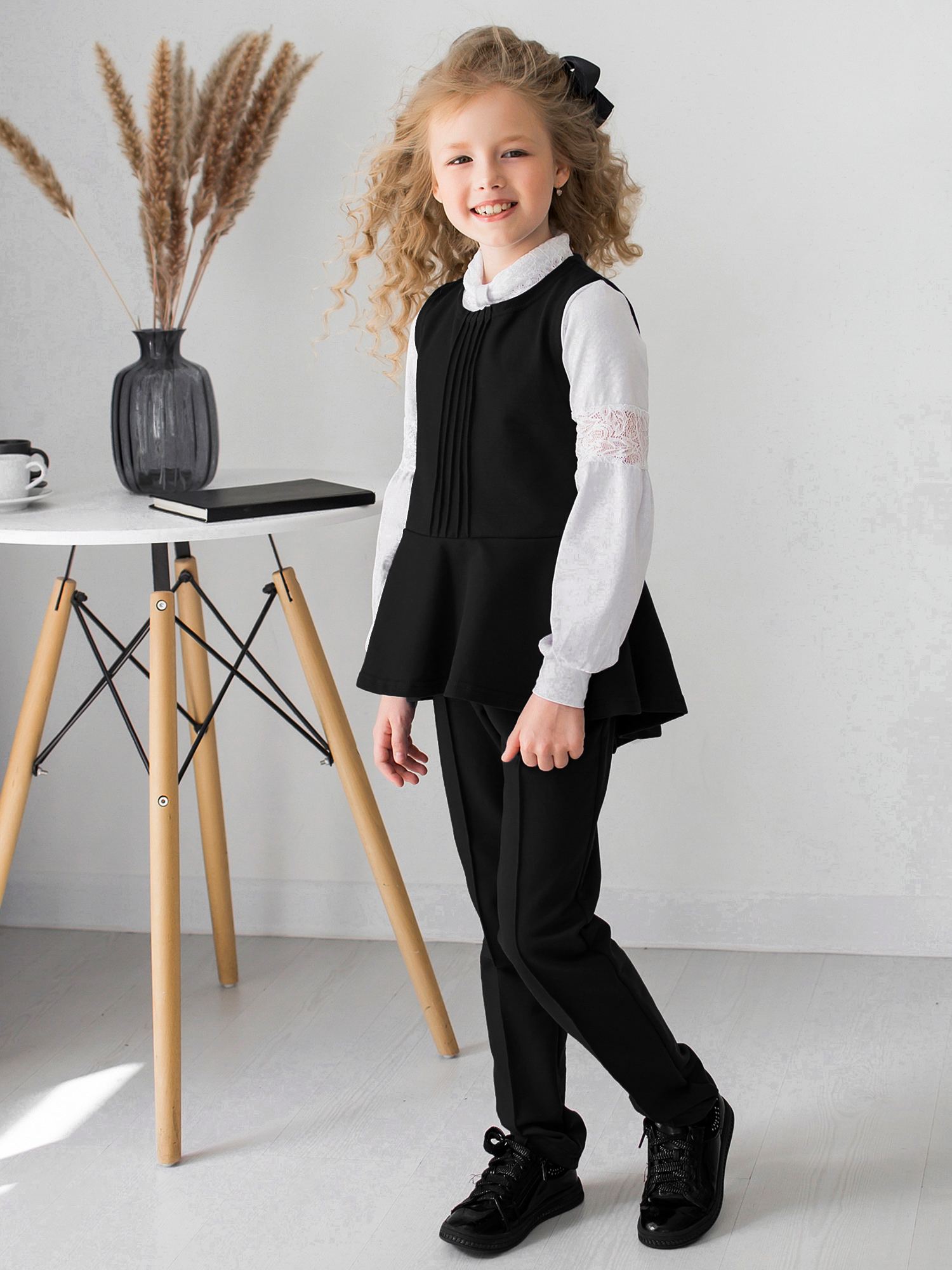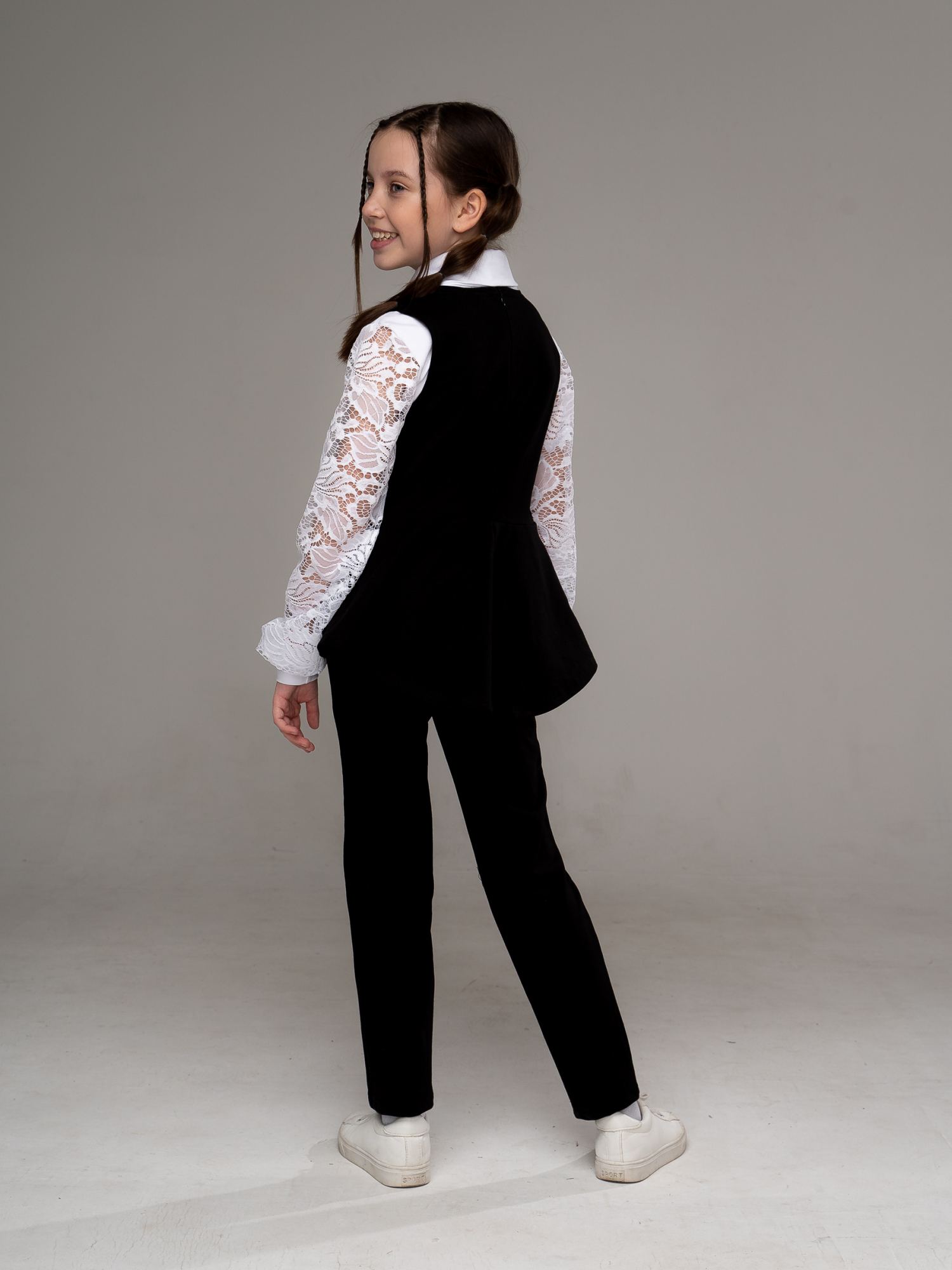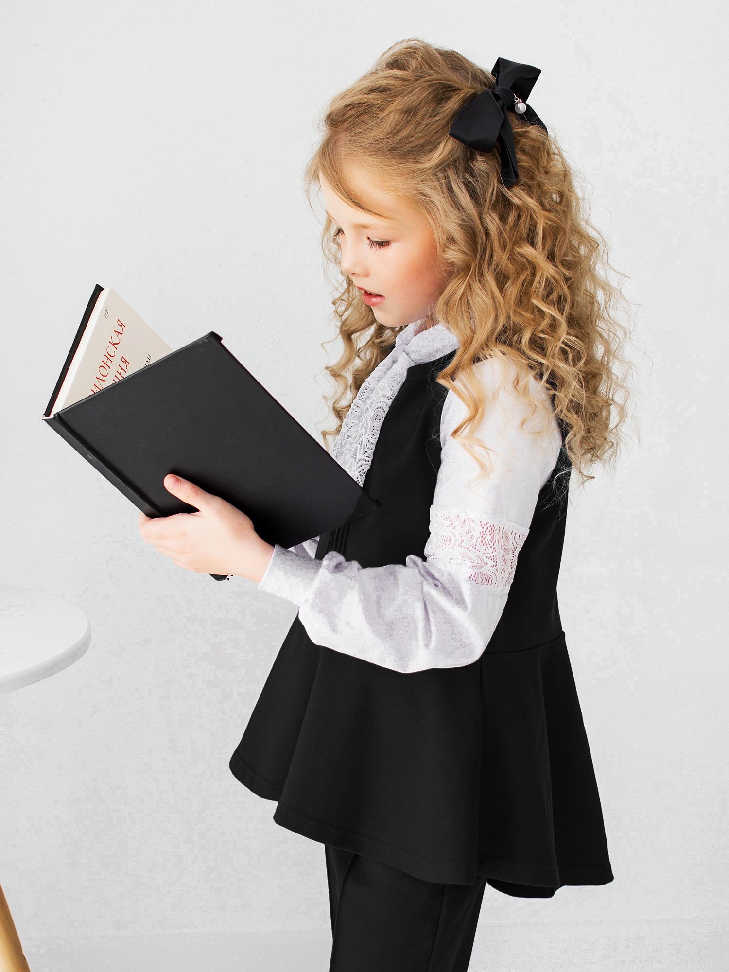 Жилет школьный из футера черного цвета для девочки , отрезной по линии талии, с расклешенной баской. Баска с асимметричной линией низа, немного удлиненная сзади. Спереди по центру - отделка в виде пяти вертикальных строчек. Изделие выполнено из трикотажа премиального качества - ПЕНЬЕ, с содержанием хлопка более 92%
