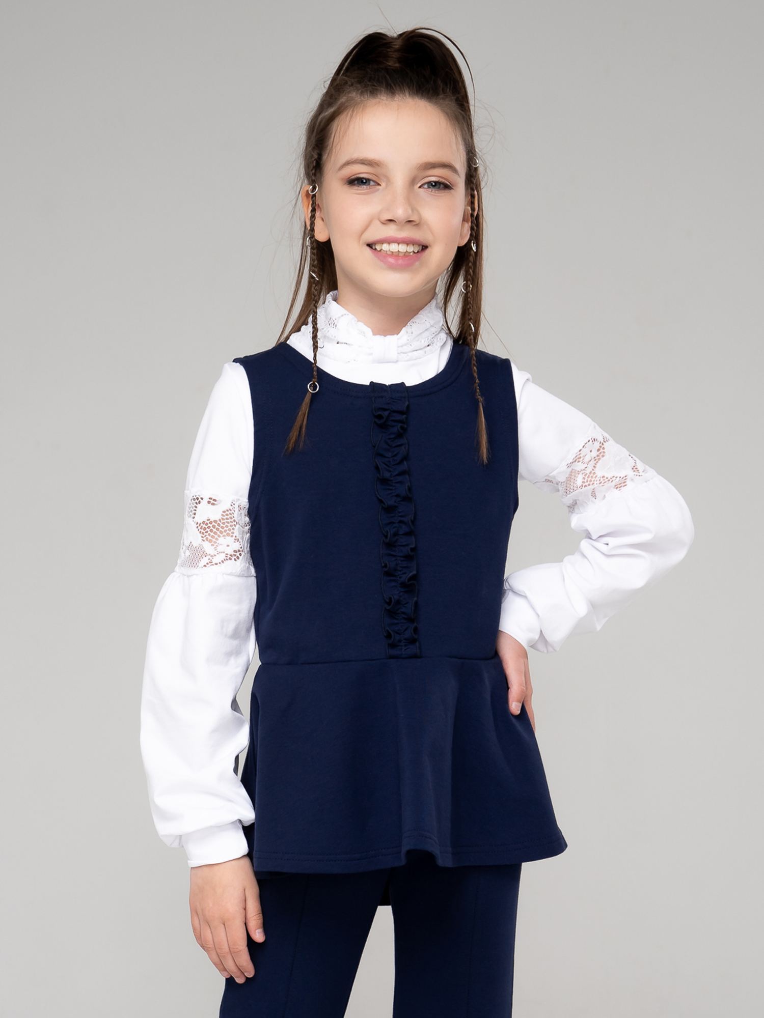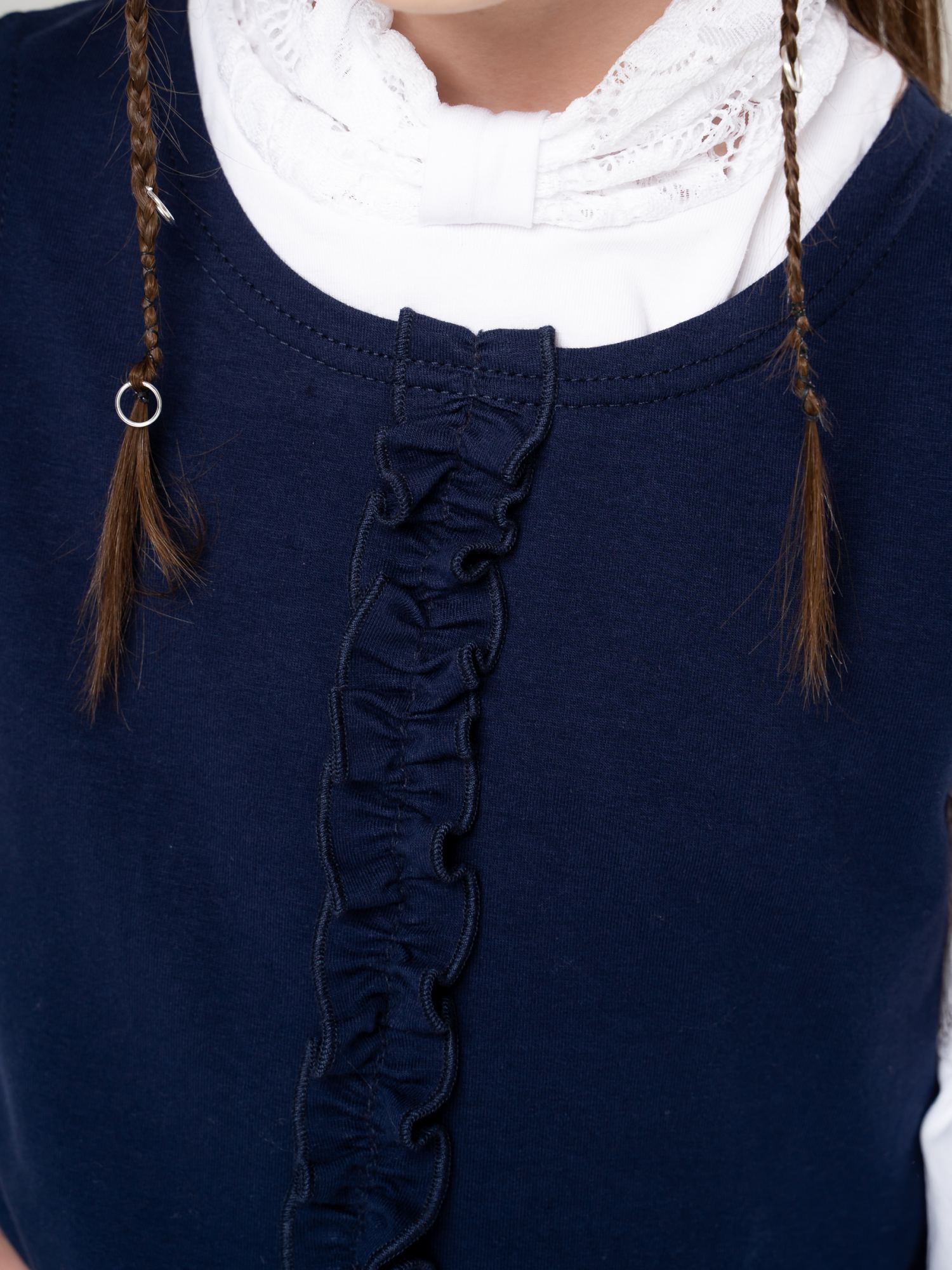 Школьный жилет из футера синего(индиго) цвета для девочки , отрезной по линии талии, с баской. По центру полочки - отделка в виде узкой рюши. Баска ассимметричного кроя, немного удлиненная сзади. Изделие выполнено из трикотажа премиального качества - ПЕНЬЕ, с содержанием хлопка более 92%