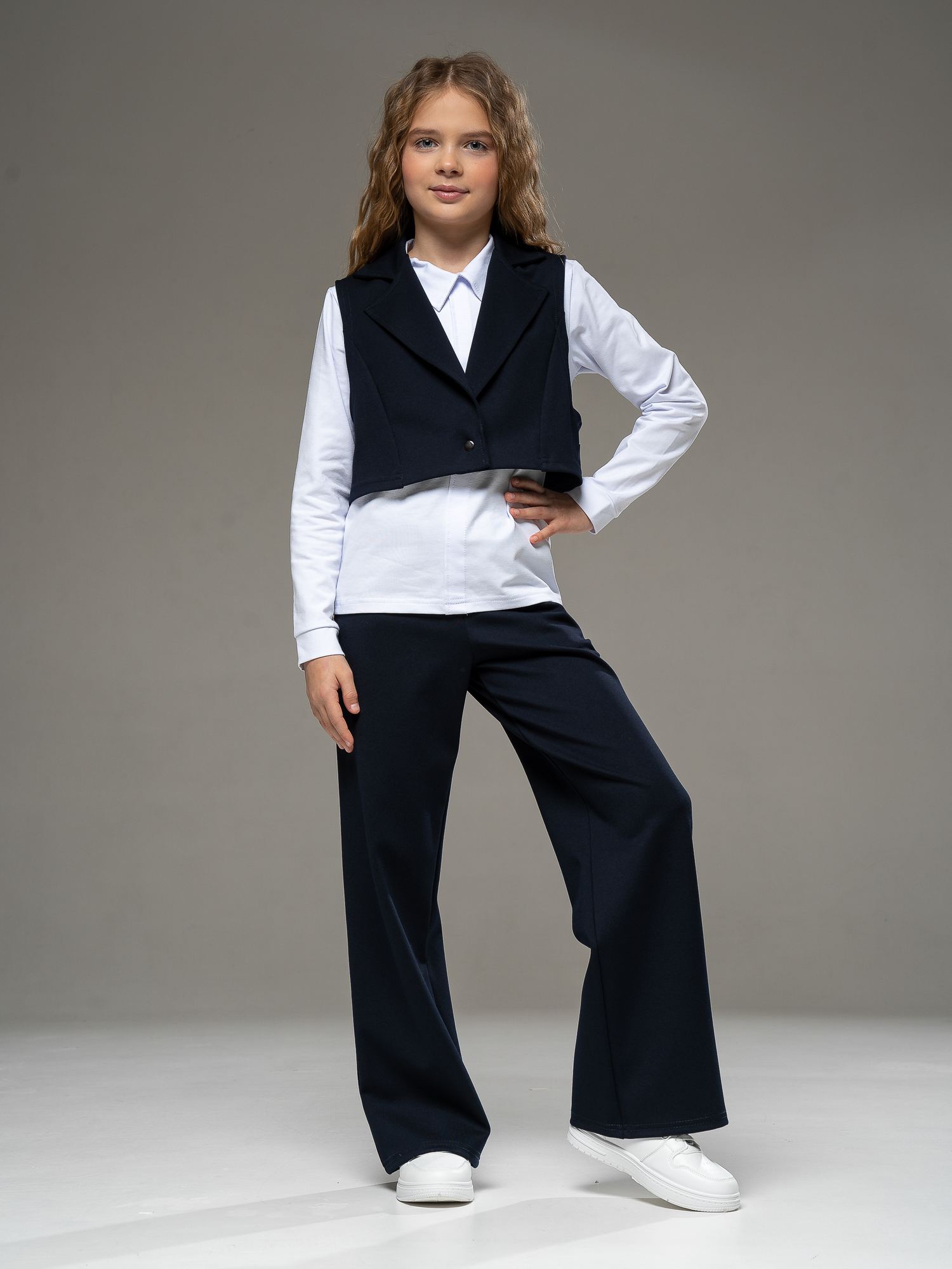 "Школьные будни – не просто обязанность, но и возможность проявить стиль и индивидуальность. Идеальным дополнением школьного гардероба вашей малышки станет укороченный жилет из джерси темно-синего цвета для девочки .