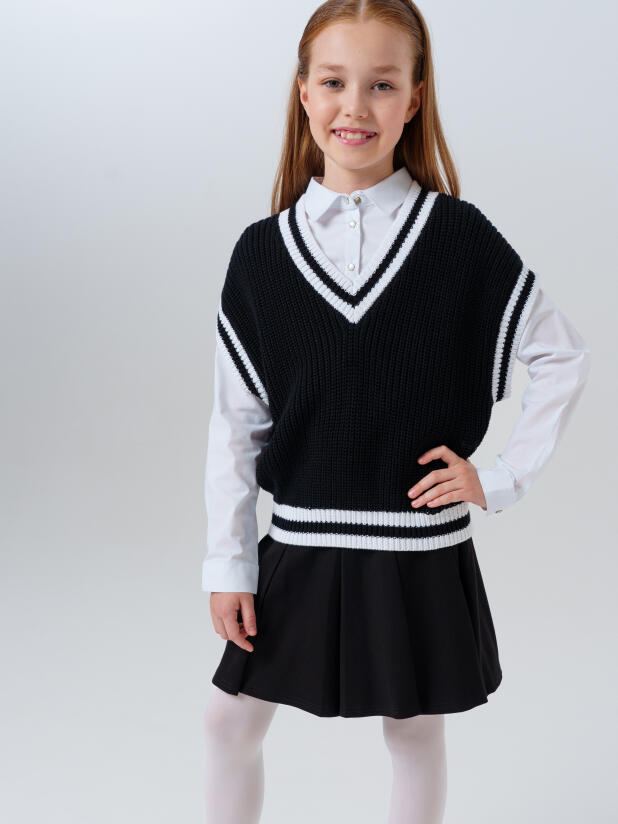 Этот черный подростковый жилет для школы отлично садится по фигуре, не сковывает движений и прекрасно сочетается с белыми рубашками, футболками, юбками и брюками из коллекции PlayToday. Современный укороченный силуэт делает модель универсальной — этот детский школьный жилет для девочек подойдёт как для классических школьных комплектов, так и для стильных повседневных образов.
