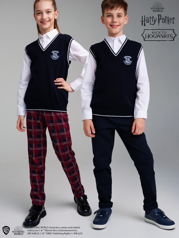 Классический лицензионный школьный темно-синий трикотажный жилет для девочки подростка из коллекции Back to Hogwarts по вселенной Гарри Поттера (Warner Bros.) от PlayToday — мечта для поклонниц магии и стиля! Элегантный хлопковый жилет прямого силуэта украшен официальной эмблемой Хогвартса, что делает его настоящей находкой для школьниц, которые хотят выделяться и чувствовать себя частью любимой истории.