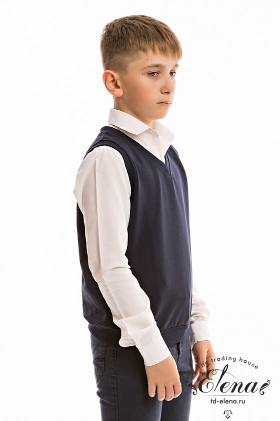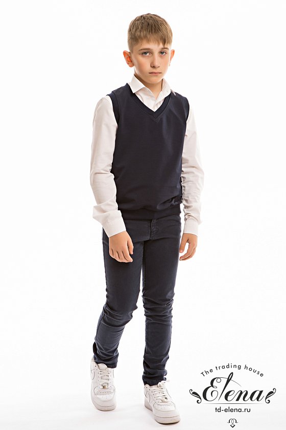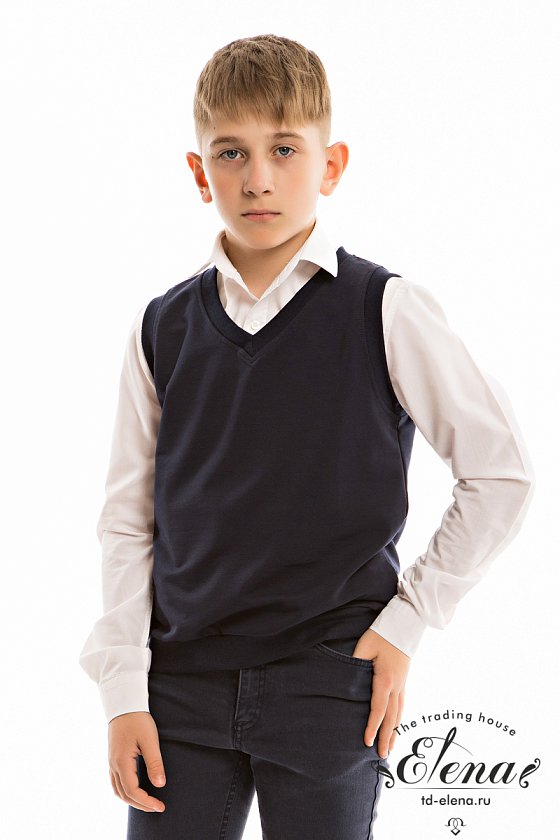 Стильный трикотажный жилет, незаменимый вариант школьной одежды на каждый день. Жилет выполнен из футер петли с лайкрой. V-образный вырез горловины, проймы и пояс оформлены планками из рибаны.