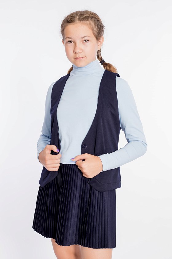 Стильный трикотажный жилет, незаменимый вариант школьной одежды на каждый день. Жилет выполнен из академика. V-образный вырез горловины, спереди застёжка на пуговицы и два накладных кармана.