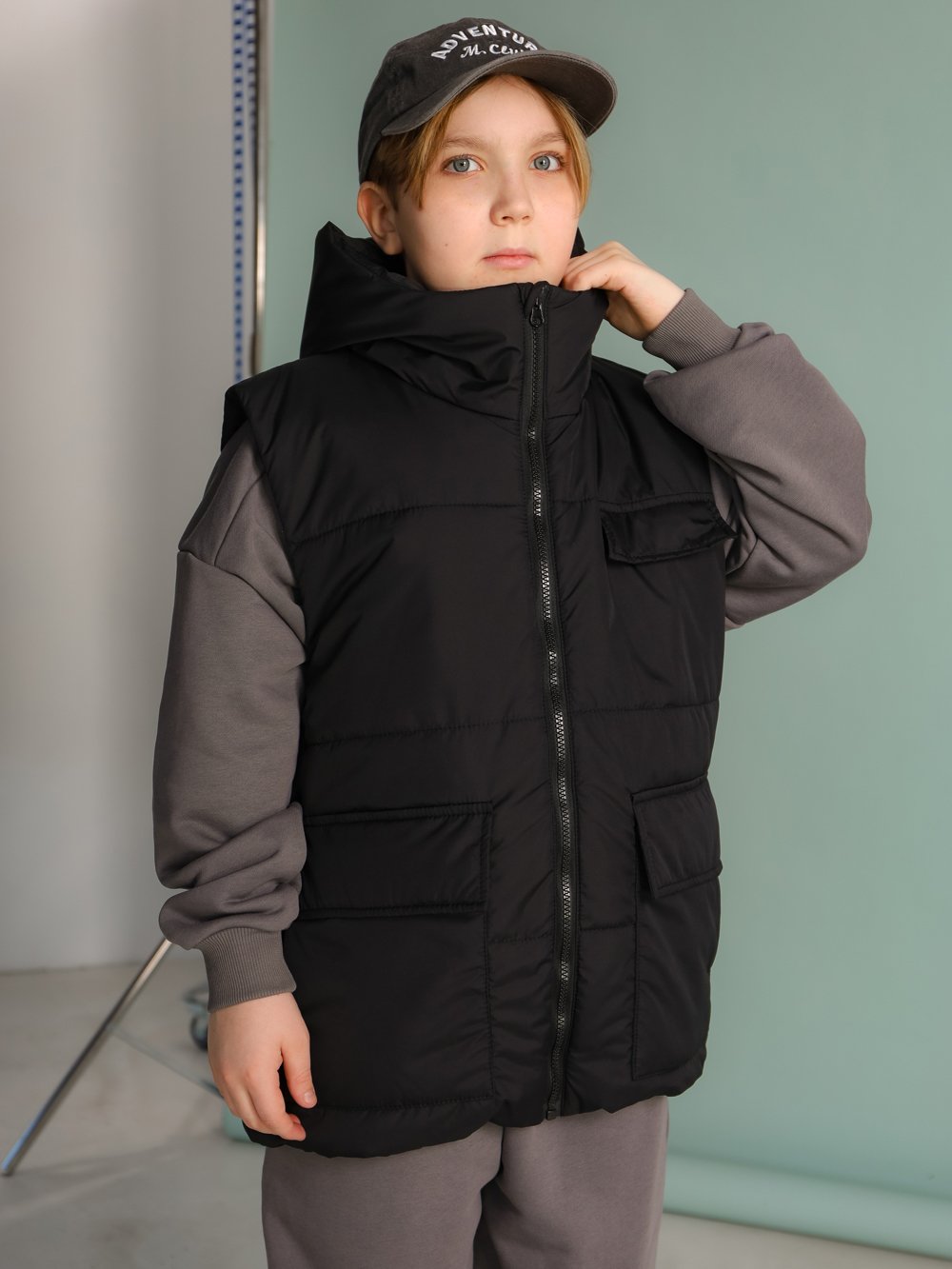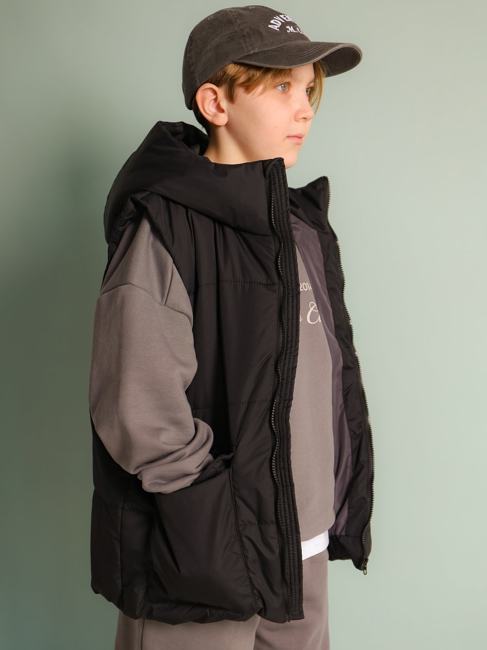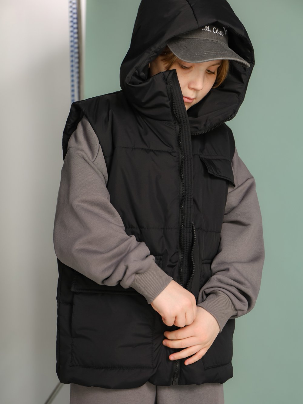 Жилет свободного силуэта с горизонтальной стежкой. Застежка на тракторную молнию с внутренним ветрозащитным пластроном. Спереди два накладных кармана (вход сбоку и сверху) с клапаном на магнитной кнопке. Имитация кармана на груди. Капюшон втачной с цельнокроеной стойкой.