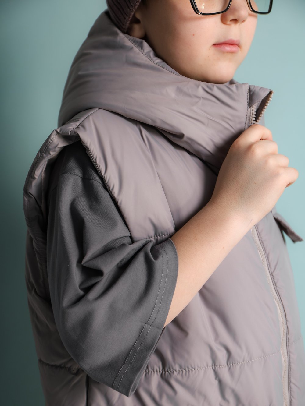Жилет свободного силуэта с горизонтальной стежкой. Застежка на тракторную молнию с внутренним ветрозащитным пластроном. Спереди два накладных кармана (вход сбоку и сверху) с клапаном на магнитной кнопке. Имитация кармана на груди. Капюшон втачной с цельнокроеной стойкой.