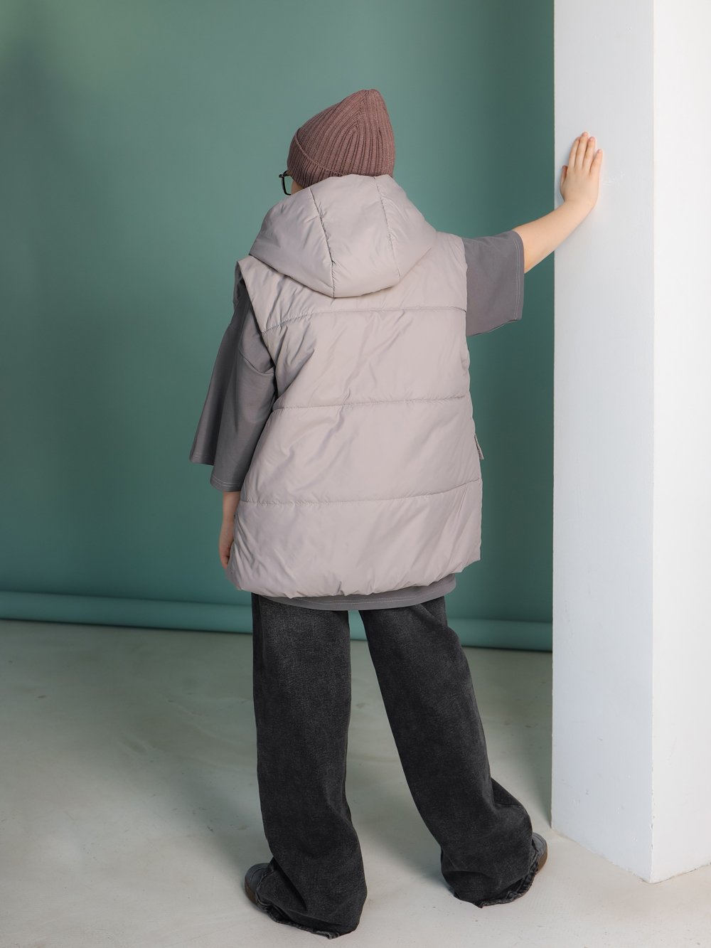 Жилет с капюшоном утепленный серо-бежевый