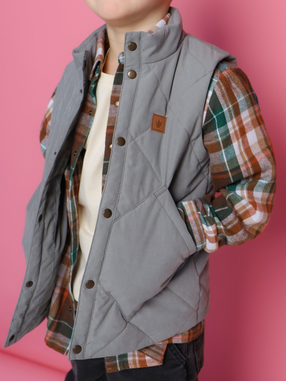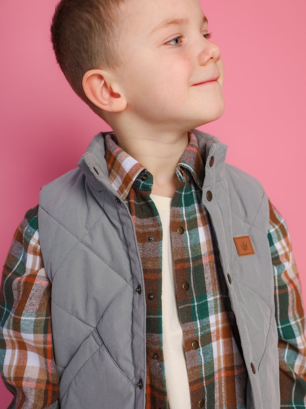 Жилет прямого силуэта с воротником-стойкой и декоративной стежкой. Основная застежка на кнопки. Два накладных кармана на полочках.