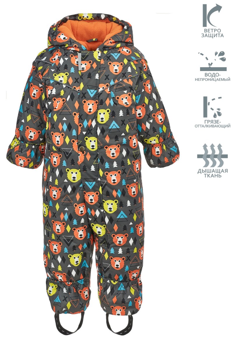 Зима Популярный зимний комбинезон Caimano Mickey из мембранной ткани для мальчиков. Очень комфортный и красивый комбинезон, а забавный принт `мордочек медвежат` уже оценили многие родители. Ткань не продувается морозным ветром, не промокает и обладает «дышащим» свойством, что предотвращает накопление лишней влаги, выводя испарение наружу, тем самым обеспечивает комфорт и сухость во время всей прогулки. Если прогулка проходит в режиме «Сон в коляске» - ручки и ножки останутся защищены от ветра благодаря удобным отворотам.
