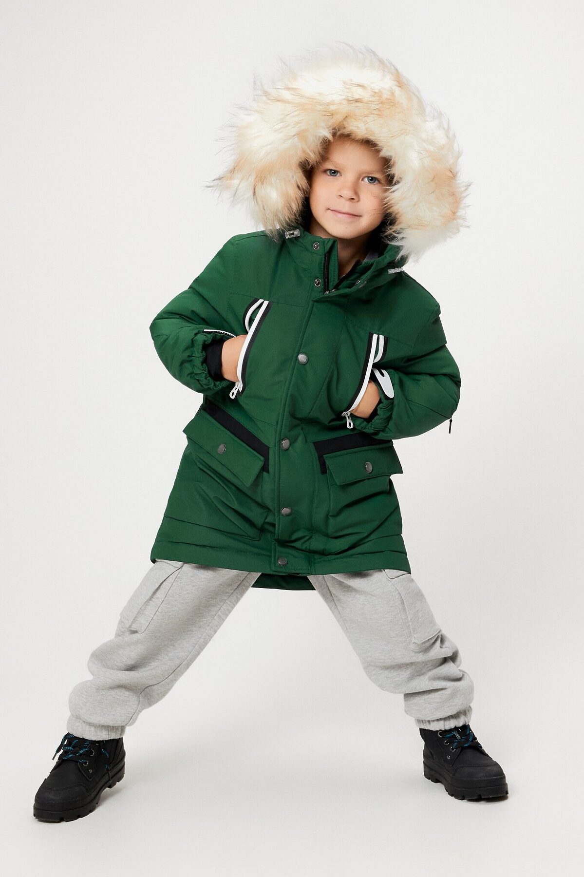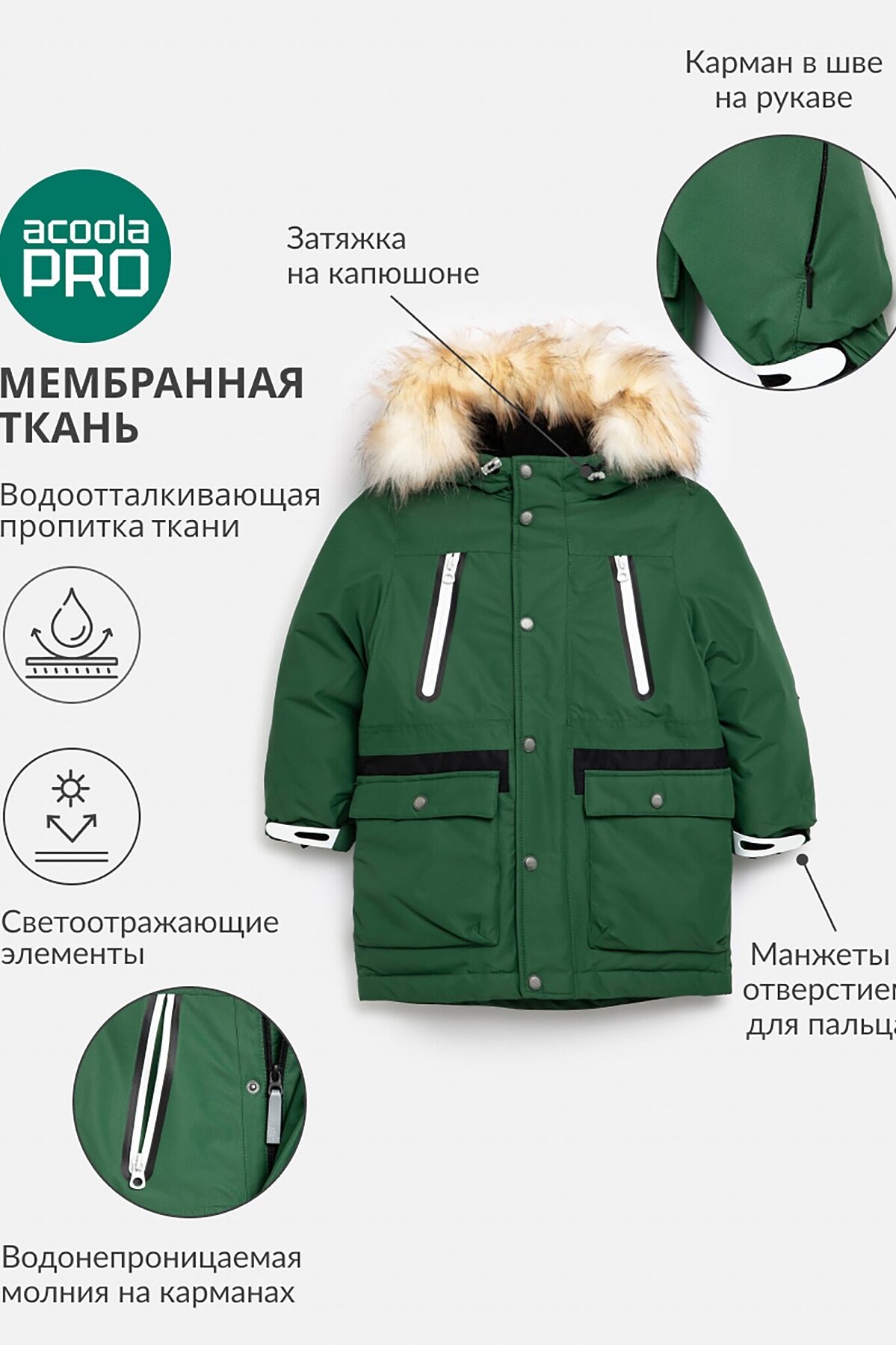 Утеплённое пальто с капюшоном для мальчика.Ткань с мембраной защищает не только от дождя и ветра снаружи, но и не покрывается влагой от испарений тела изнутри. Это делает ткань не только гидрофобной, но и дышащей. Водонепроницаемость 5000 защитит и от моросящего дождя, и даже от кратковременного ливня. Наполнитель - синтепух (вес 350 гр/м2). Рекомендованный температурный режим от -5 до -30 градусов. Проклеенные швы. Подкладка для тела и капюшона выполнена из флиса, в рукавах стандартная подкладочная ткань. Застёжка на молнию с внешней и внутренней ветрозащитными планками. Спереди два накладных кармана, два нагрудных кармана на водонепроницаемой молнии. Капюшон с отстегивающимся мехом. Трикотажные манжеты-митенки с прорезью для большого пальца. Утяжка по талии изнутри и на капюшоне. Светоотражающие принты и элементы обезопасят ребёнка от машин в темное время суток.