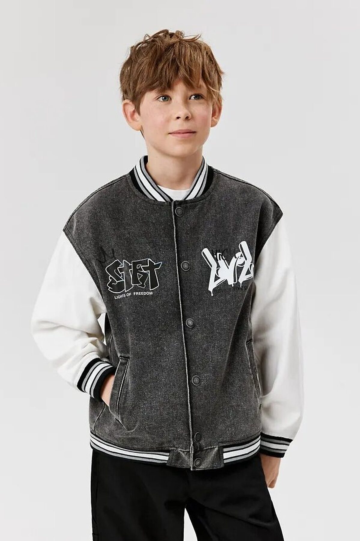 Детская джинсовая куртка-бомбер с принтом в стиле граффити для мальчика - это модное и практичное дополнение к гардеробу ребенка. Основная часть изделия выполнена из денима, что обеспечивает удобство в ношении. Рукава из твила создают приятные ощущения на коже. Застежка на металлические кнопки облегчает одевание. Два прорезных кармана позволяют хранить необходимые мелочи. Воротник, манжеты и низ изделия обработаны рибовым полотном, что обеспечивает лучшее прилегание к телу и сохранение тепла. Спереди расположен текстовый принт "STRT LIGHTS OF FREEDOM|HIGH LIVE|NEVER GIVE UP" англ. - "Улица - свет свободы|Высокий уровень|Никогда не сдавайся", который подчеркивает современный вид изделия. Стилизуйте бомбер в сером цвете со свитшотом, футболкой и джинсами для создания модного многослойного образа на прогулки.