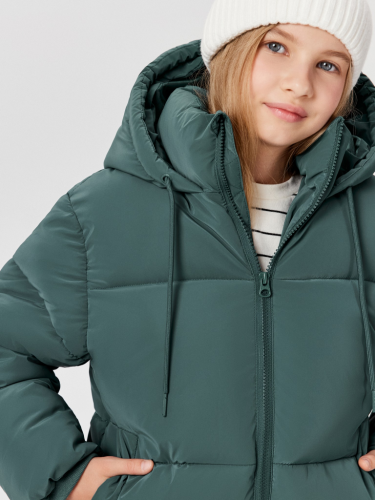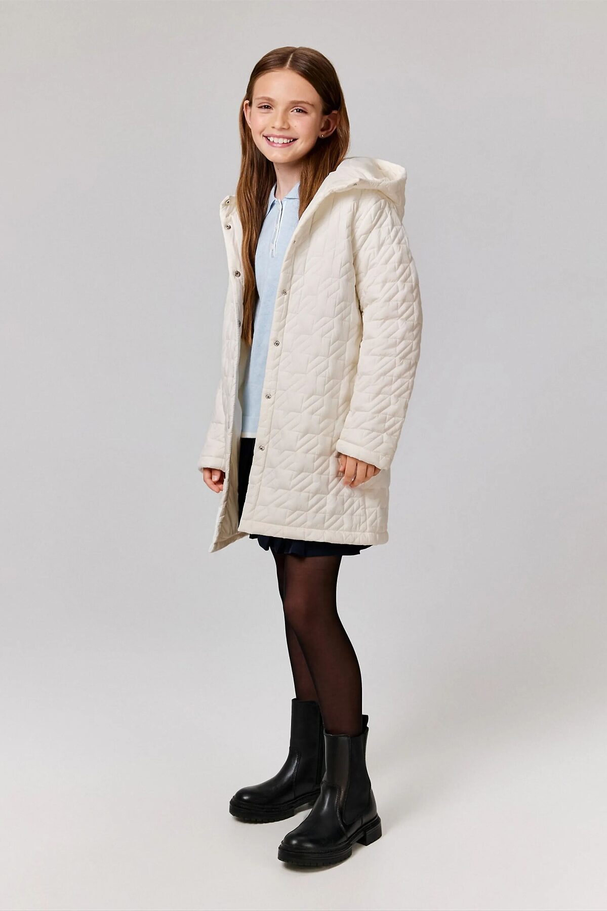 Детское утеплённое пальто с капюшоном для девочки изготовлено из водонепроницаемой ткани, которая легко выдерживает мелкий дождь, туман и сырость. Удлиненная куртка с декоративной стёжкой смотрится стильно и необычно. Пальто утеплено синтепоном (вес - 180гр/м2), поэтому будет комфортно носиться при температуре от +15 до 0 градусов. Подкладка для тела выполнена из стандартной подкладочной ткани. Спереди расположена застёжка на брендированные кнопки в тон основной ткани. В боковых швах расположены карманы, добавляющие функциональности. Несъемный капюшон укроет ребенка от ветра и непогоды. Короткий воротник-стойка предотвращает задувание холодного воздуха. Базовый молочный цвет будет легко сочетаться с повседневными луками или школьной формой. Рост модели 143 см, размер на модели 140.