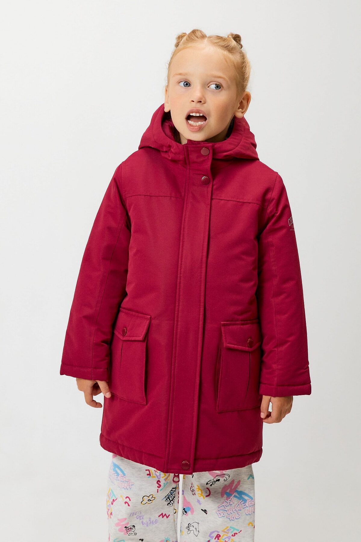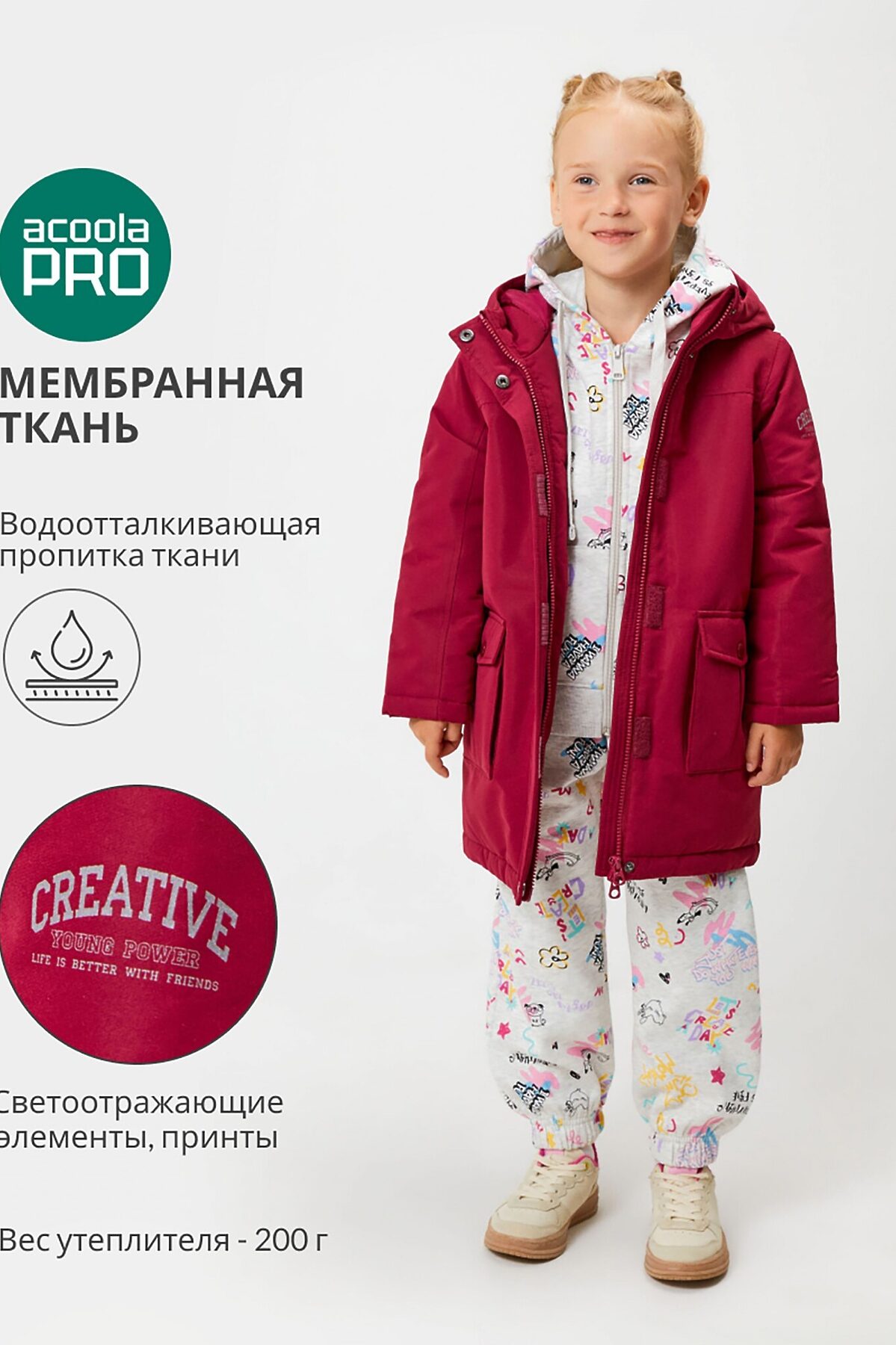 Утеплённая куртка с капюшоном для девочки. Ткань с мембраной защищает не только от дождя и ветра снаружи, но и не покрывается влагой от испарений тела изнутри. Это делает ткань не только гидрофобной, но и дышащей. Водонепроницаемость 5000 защитит и от моросящего дождя, и даже от кратковременного ливня. Подкладка, простеганная вместе с утеплителем, выполнена из стандартной подкладочной ткани. Утеплитель – синтепон (вес 200гр/м2). Рекомендованный температурный режим от +5 до -20 градусов. Застёжка на молнию с внешней и внутренней ветрозащитными планками убережёт от холодного воздуха и влаги; внешняя планка дополнительно застёгивается на металлические кнопки. Спереди два кармана с клапанами. Утяжка по талии изнутри. Капюшон несъёмный. На внутренней стороне также расположен ярлык для имени, который поможет не потерять куртку в гардеробе школы или кинотеатра. Светоотражающие принты на капюшоне, рукаве* и спинке** обезопасят ребёнка вблизи дорог. *«CREATIVE» англ. – «Креатив», «YOUNG POWER» англ. – «Сила юности», «LIFE IS BETTER WITH FRIENDS» англ. – «С друзьями жизнь лучше».**«AWESOME TEAM» англ. – «Потрясающая команда», «CREATE YOUR OWN STYLE, BRIGHT AND UNIQUE IMAGES» англ. – «Создай свой собственный стиль, яркие и уникальные образы», «YOUNG POWER» англ. – «Сила юности»Куртка представлена в двух цветах: тёмно-синем и бордовом. Рост моделей на фото: 110 Бордовый