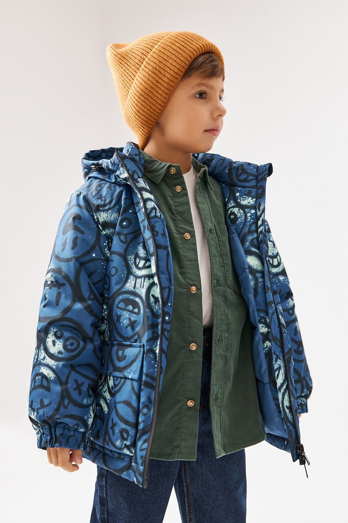 Детская утеплённая куртка в синем цвете для мальчика выполнена из мембранной ткани с водоотталкивающей пропиткой. Ткань с мембраной защищает не только от дождя и ветра снаружи, но и не покрывается влагой от испарений тела изнутри. Это делает её не только гидрофобной, но и дышащей. Подкладка изделия выполнена из стандартной подкладочной ткани. Вид утеплителя - синтепон, состав утеплителя 100% полиэстер (200г/м2). Рекомендованный температурный режим от +10 до - 10 градусов. Застёжка на молнию с внутренней ветрозащитной планкой предотвращает проникновение холода, а защита от защемления подбородка добавляет комфорт при ношении. Яркие принты в виде смайликов по всему изделию придают куртке яркий и оригинальный вид. Капюшон с утяжкой защищает от ветра во время прогулок на свежем воздухе. Спереди расположены два больших накладных кармана на кнопках, в которые можно удобно сложить мелочи или согреть руки. Низ рукавов с внутренней резинкой предотвращает задувание холодного воздуха. Модель выполнена в двух цветах: темно-сером и синем с принтами в виде смайликов, которые добавляют яркого акцента в наряд. Стилизуйте куртку со штанами и свитером для создания теплого и комфортного образа на прогулки на свежем воздухе или во время других активных занятий. Рост и размер модели на фото 110.