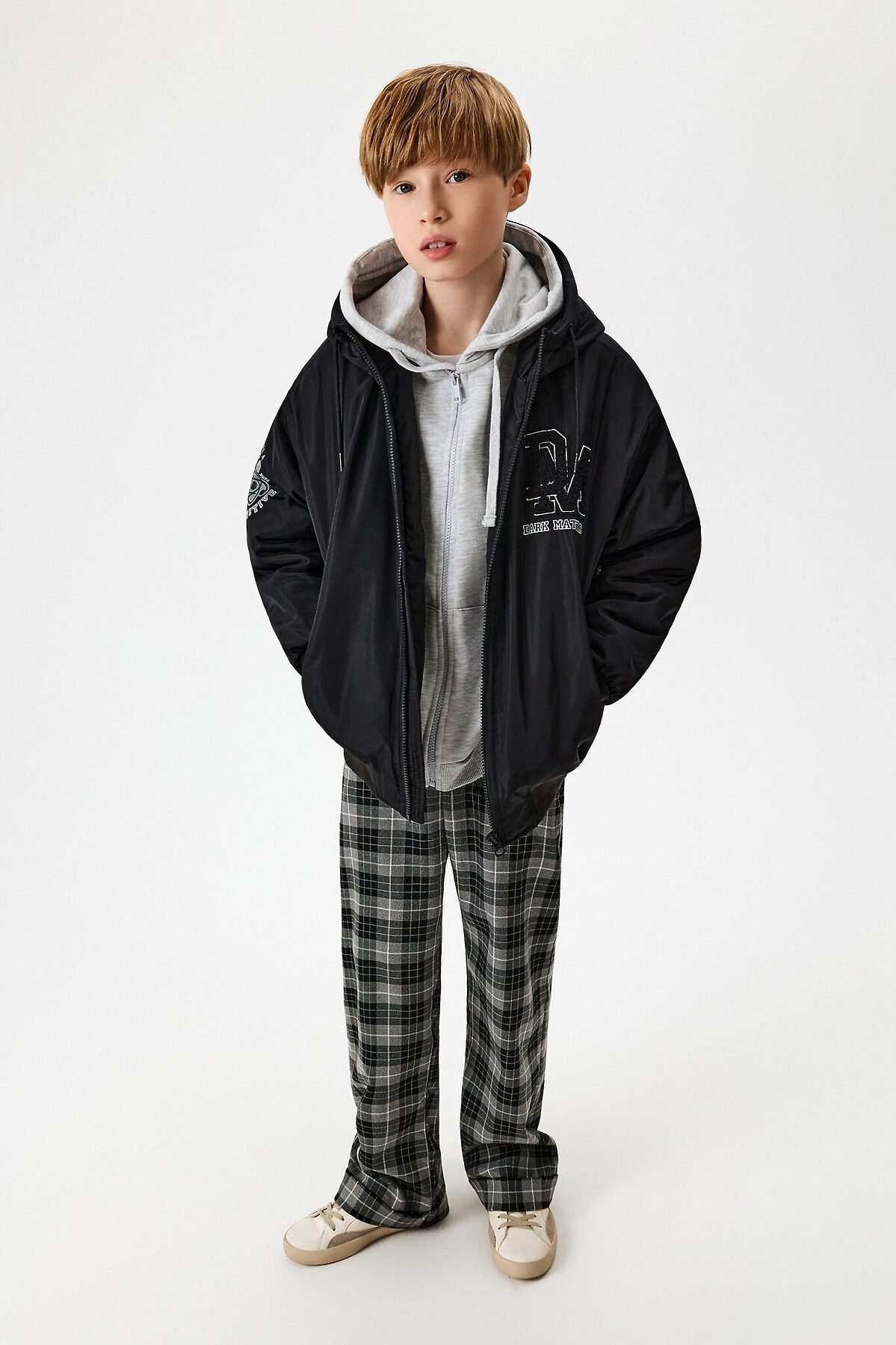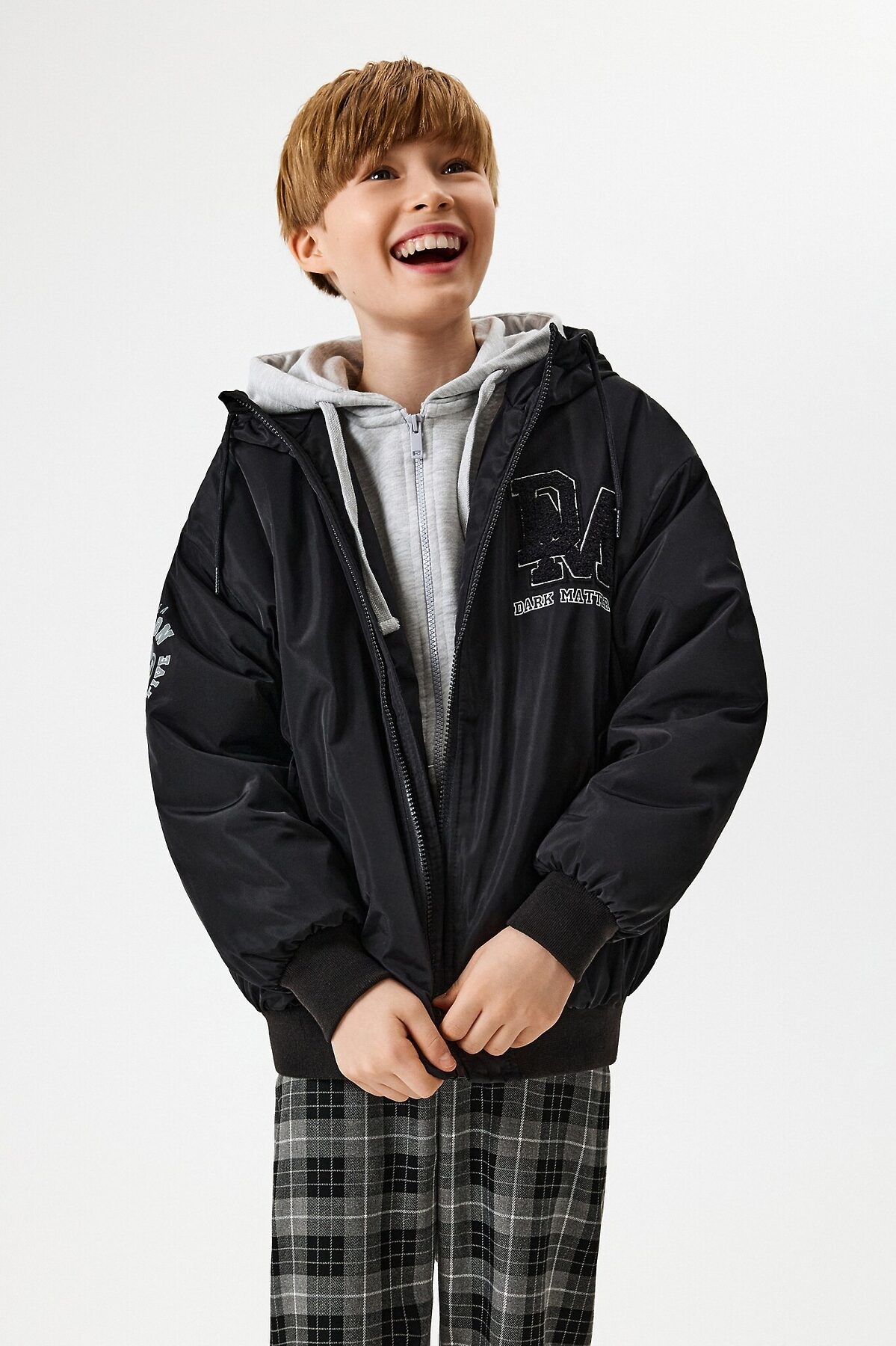 Детская утеплённая куртка для мальчика выполнена из ткани с водоотталкивающей пропиткой, которая защищает от влаги и ветра, обеспечивая комфорт в непредсказуемую погоду. Подкладка из стандартной подкладочной ткани. Вид утеплителя - синтепон (120г/м2), состав 100% полиэстер. Рекомендованный температурный режим от 0 до +15 градусов. Застёжка на молнию с внутренней ветрозащитной планкой предотвращает проникновение холодного воздуха. Специальная защита от защемления подбородка делает модель более комфортной. Два накладных кармана с клапанами на кнопках не только позволяют согревать руки, но и хранить необходимые мелочи. Несъёмный капюшон с утяжкой защищает от ветра. Рукава с приспущенной линией плеча добавляют свободу движений, что особенно важно для активных детей. Эластичная манжета на рукавах и по низу изделия помогает сохранить тепло, обеспечивая дополнительную защиту от холода. Спереди куртку украшает нашивка с ковровой вышивкой и надписью ""DARK MATTER"" англ. - ""Темная материя"", также рукав с рисунком протона с вдохновляющим слоганом в космическом стиле. Модель представлена в двух цветах: чёрном и серо-голубом. Стилизуйте куртку в чёрном цвете со спортивными брюками и толстовкой, чтобы создать практичный и тёплый образ для прогулок в прохладную погоду.
