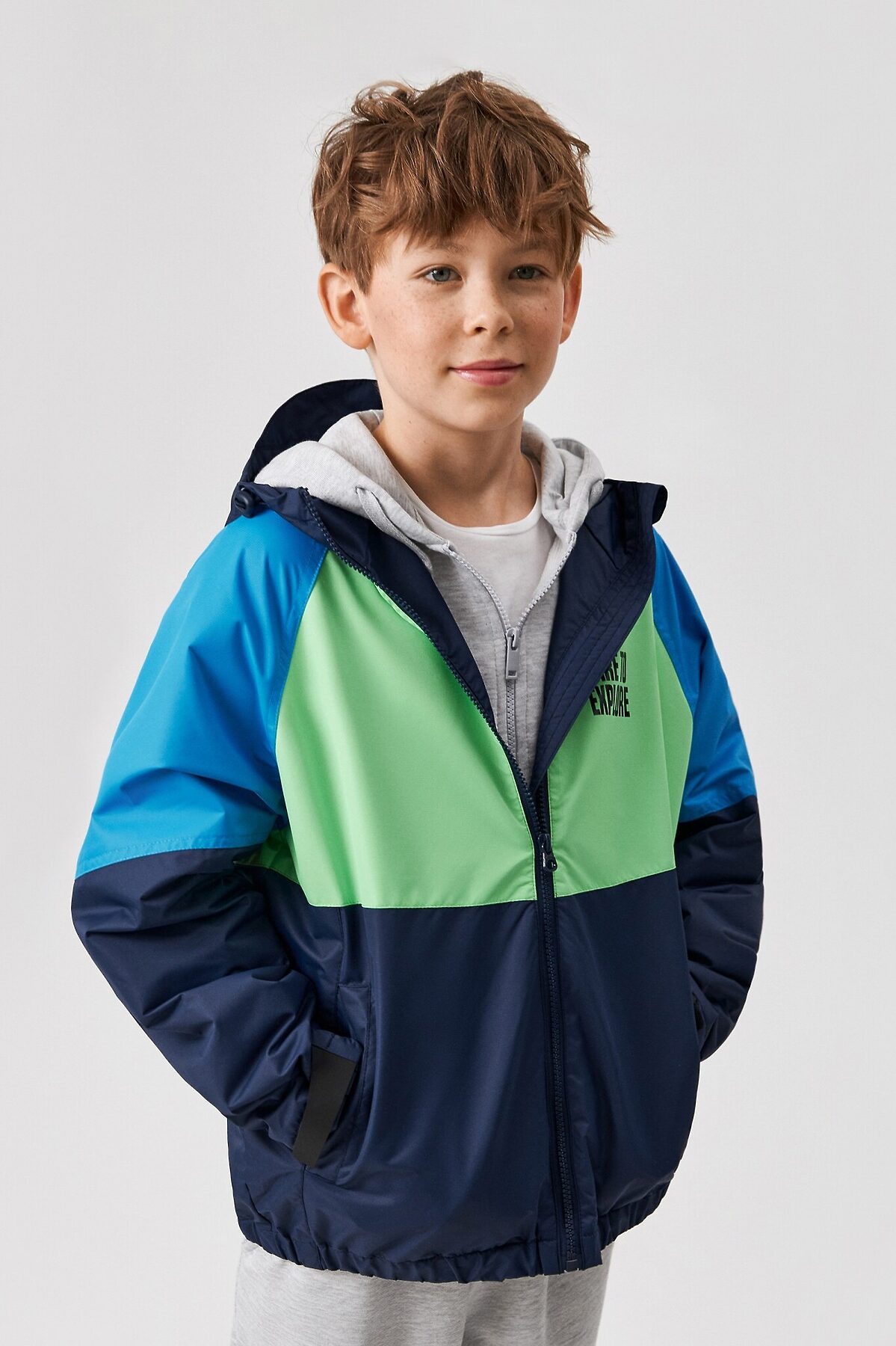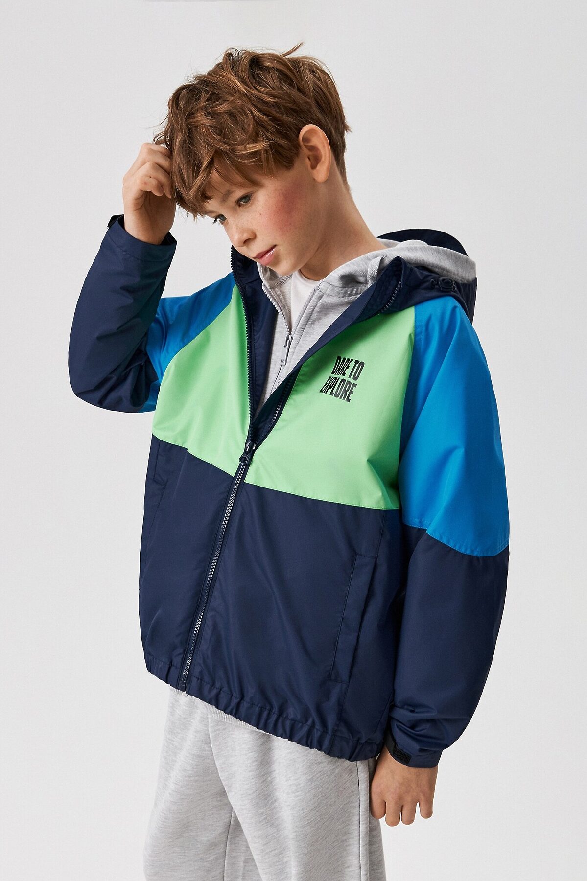 Детская куртка-ветровка для мальчика изготовлена из ткани с водоотталкивающей пропиткой, которой не страшны мелкий дождь, туман и сырость. Подкладка выполнена из стандартной подкладочной ткани. Модель без утеплителя. Рекомендованный температурный режим от +5 до +20 градусов. Рукав покроя реглан обеспечивают комфортную посадку на разную ширину плеч. Низ рукавов регулируется пластиковой патой с липучкой для регулировки прилегания и сохранения тепла. Спереди расположена застежка на молнию с внутренней ветрозащитной планкой и защитой от защемления. Для хранения мелочей в куртке предусмотрены карманы с листочкой. Капюшон с козырьком и с кулиской, которая фиксируется на шнур, укроет ребенка от ветра и непогоды. Расцветка в стиле колор блок сделает образ заметным и ярким. На груди куртку украшает принт с надписью "DARE TO EXPLORE" англ. - "Осмелься исследовать". Комбинируйте куртку в образе со спортивным костюмом, чтобы создать комфортный образ.