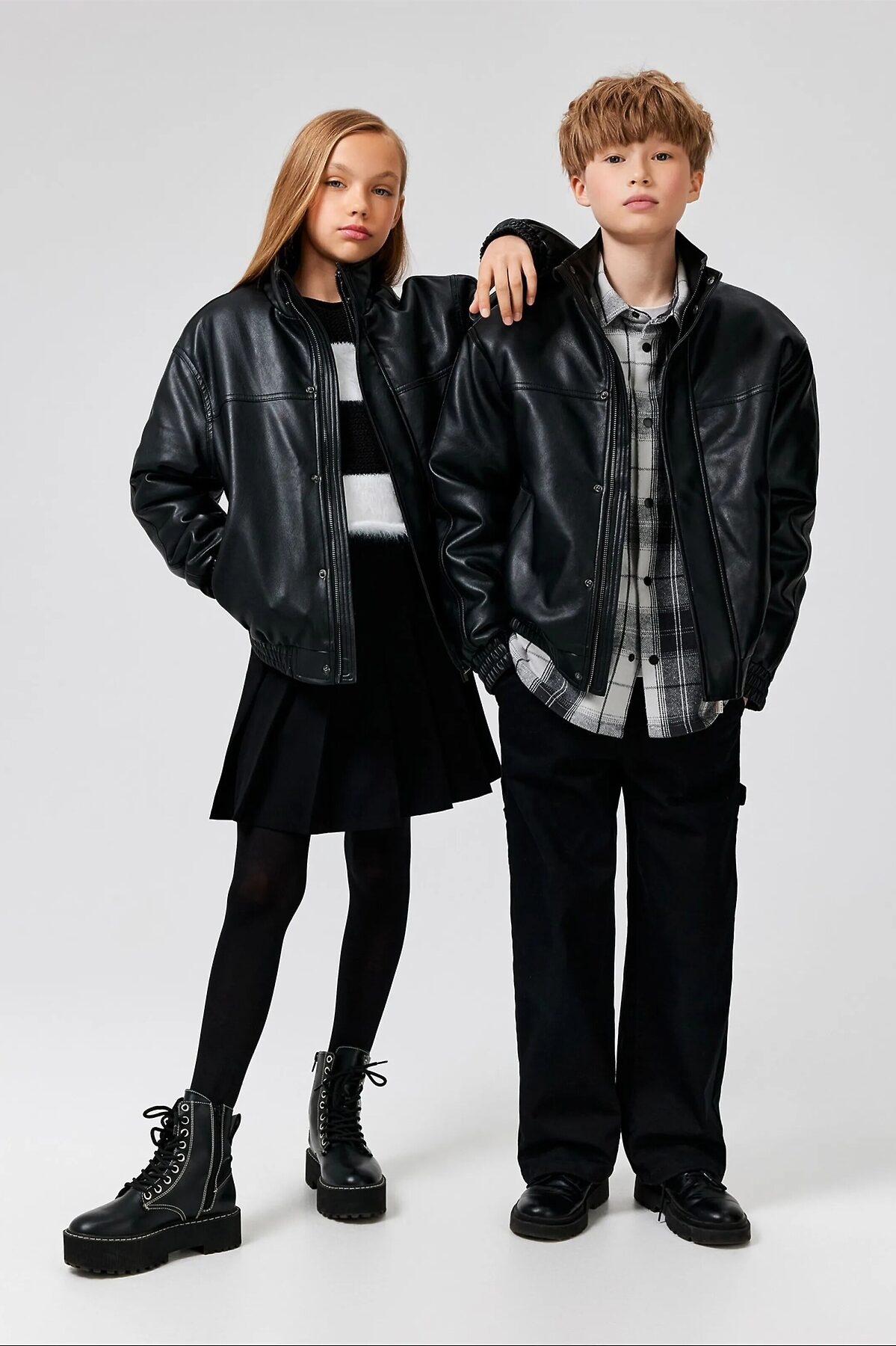 Детская утеплённая куртка для мальчиков и девочек изготовлена из качественной экокожи. Куртка унисекс утеплена синтепоном (вес 100гр/м2), что обеспечивает комфортное ношение при температуре от +15 до 0 градусов. Подкладка выполнена из стандартной подкладочной ткани. Куртка объемного кроя со спущенной линией плеча создает модный силуэт и позволяет создавать многослойные сложные образы. Спереди расположена центральная застёжка на молнию с внутренней и внешней ветрозащитными планками; внешняя застегивается на кнопки. Спереди расположены два кармана, добавляющие модели практичности. Низ изделия и рукавов дополнен эластичными манжетами для лучшего прилегания к телу и сохранения тепла. Воротник-стойка закрывает горло от ветра и избавляет от необходимости носить шарф. Кожаная куртка черного цвета легко сочетается с образами в разных стилях и добавляет им модный штрих. Рост мальчика-модели 145 см, размер на модели 140. Рост девочки-модели 141 см, размер на модели 140.