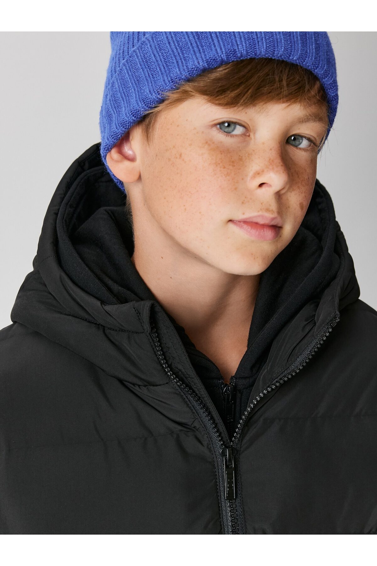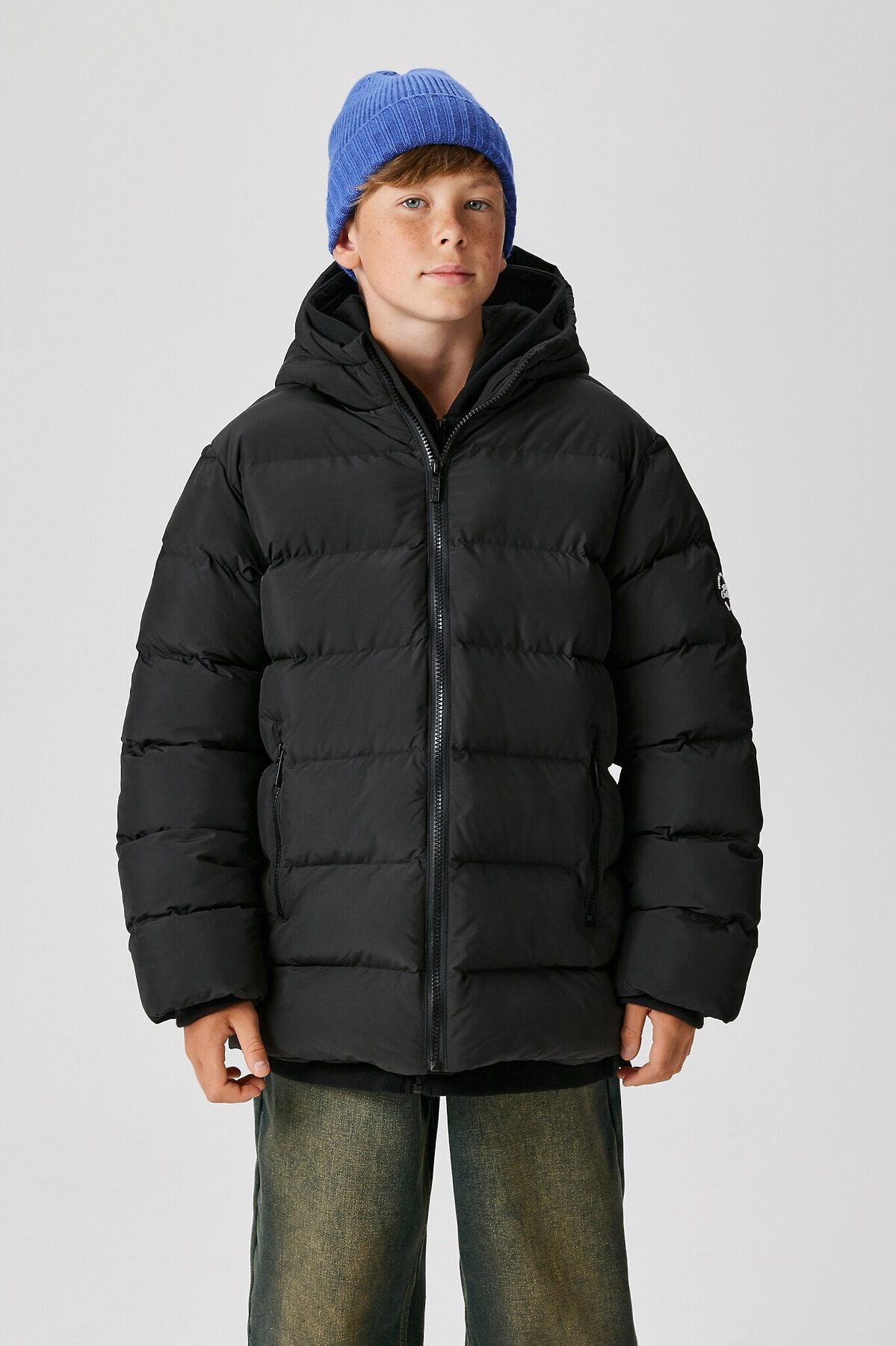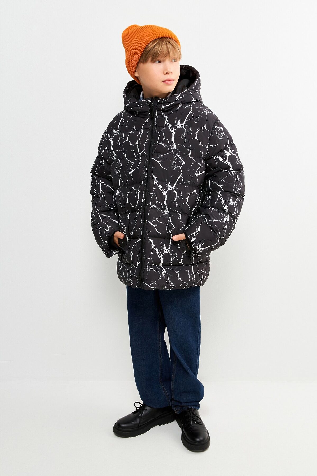 Утеплённая куртка с принтом для мальчика выполнена из ткани с водоотталкивающей пропиткой, которой не страшны мелкий дождь, туман и сырость. Куртка с тканой стежкой утеплена синтепухом (вес 250 гр/м2), что делает комфортным ношение при температуре от +5 до -15 градусов. Подкладка для тела и карманов выполнена из стандартной гладкой подкладочной ткани. Спереди расположена застёжка на молнию с защитой от защемления подбородка и внутренней ветрозащитной планкой. Практичности добавляют два кармана на молнии, в которых удобно хранить перчатки или греть руки. Рукава с трикотажными манжетами плотно прилегают к запястьям, предотвращая продувание. Куртка с несъемным капюшоном укроет ребенка от ветра и непогоды. На левом рукаве расположен декоративный силиконовый патч с надписями "FOLLOW YOUR POTENTIAL | URBAN CULTURE | CHOOSE ACOOLA" англ. - "Следуй за своим потенциалом | Уличная культура | Выбери "Акулу" . Куртку украшает стильный черно-белый принт, который делает образ более оригинальным и запоминающимся. Стильная и практичная, куртка для мальчика займет прочное место в гардеробе верхней одежды.