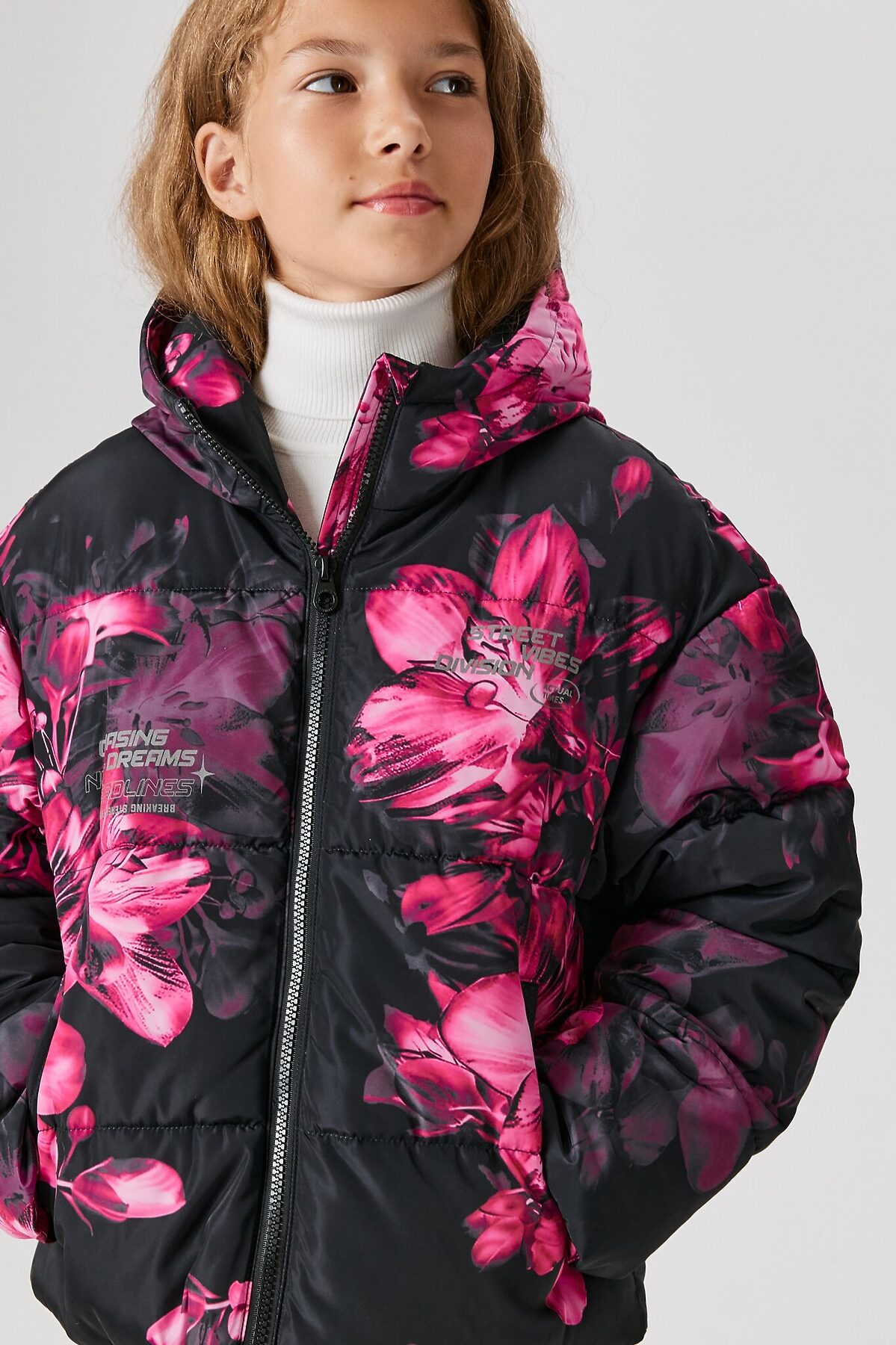 Утеплённая стеганая куртка в цветочек для девочки выполнена из водонепроницаемой ткани, которой не страшны мелкий дождь и мокрый снег. Куртка с капюшоном утеплена синтепухом (вес — 300 г/м2), что делает комфортным ношение при температуре от +5 до -15 градусов. Подкладка для тела и карманов выполнена из стандартной гладкой подкладочной ткани. Спереди расположена застёжка на молнию с защитой от защемления подбородка и внутренней ветрозащитной планкой. Практичности модели добавляют два кармана c листочкой, в которых удобно хранить перчатки или греть руки. Низ изделия регулируется эластичным шнуром со стоппером, что обеспечивает плотное прилегание к телу и предотвращение продувания. Низ рукавов с трикотажными манжетами, что дополнительно защищает от холодного воздуха. Несъемный капюшон укроет ребенка от ветра и непогоды. Куртку украшает яркий принт с изображением розовых цветов. На груди расположен принт с надписями "STREET VIBES DIVISION | ACTUAL TIMES | CHASING DREAMS | NO DEADLINES |BREAKING STEREOTYPES | CREATE NEW CULTURE | 365 DAYS/24HRS" англ. - "Отдел уличных вайбов | Настоящее время | В погоне за мечтой | Никаких дедлайнов | Создать новую культуру | 365 дней/24 часа". Яркая и стильная, куртка станет отличным выбором для холодной погоды.