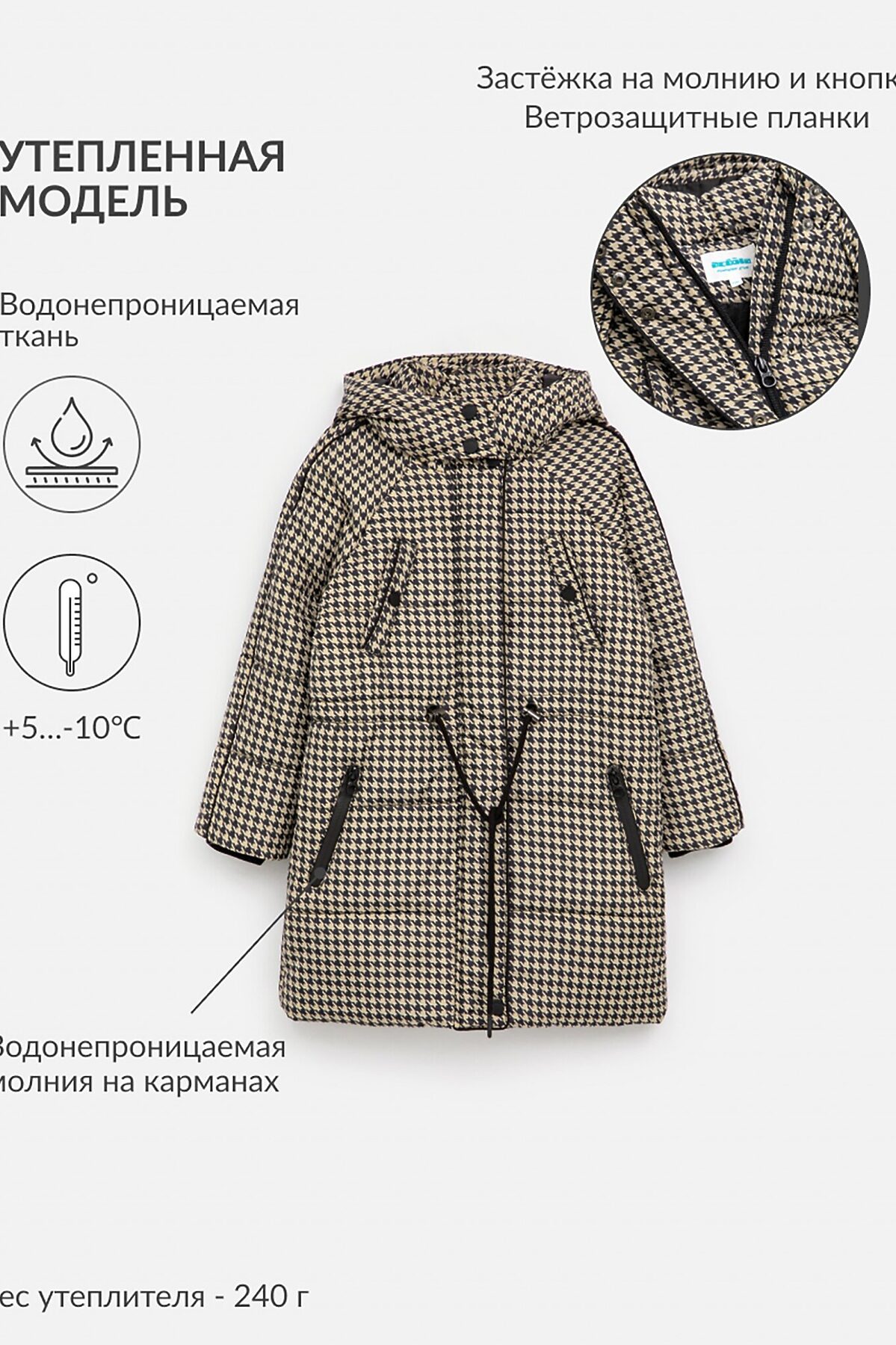 Утеплённое стеганое пальто с капюшоном для девочки изготовлено из водонепроницаемой ткани. Наполнитель - синтепон (вес 180-250гр/м2). Рекомендованный температурный режим от +5 до -10 градусов. Подкладка для тела и карманов выполнена из стандартной подкладочной ткани. Застёжка на молнию и кнопки с внешней и внутренней ветрозащитными планками. Спереди два кармана на водонепроницаемую молнию и два кармана на кнопках. Утяжка на талии. Трикотажные манжеты предотвращают задувание холодного воздуха. Рост модели на фото: 110