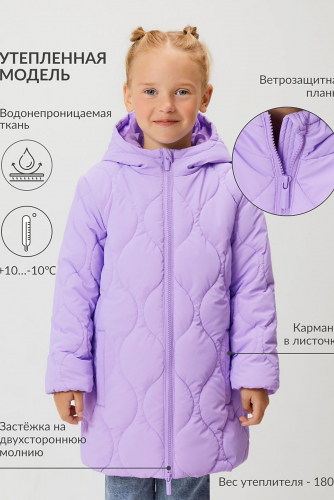 Утеплённое стеганое пальто с капюшоном для девочки сшито из водонепроницаемой ткани. Утеплитель – синтепон (вес 180-250гр/м2). Рекомендованный температурный режим от +10 до -10 градусов. Подкладка для тела и карманов выполнена из стандартной подкладочной ткани. Застёжка на двухстороннюю молнию с внутренней ветрозащитной планкой. Спереди два кармана в листочку. Несъёмный капюшон без опушки с небольшим воротником-стойкой защитит от ветра и непогоды. Рукава без манжет плотно прилегают к запястьям, исключая продувание. Универсальная длина до колена. Стилизуйте пальто с джинсами (арт. 20220440081), при необходимости добавьте тёплый свитер с воротником-стойкой (арт. 20220320100).Пальто представлено в двух цветах: светло-фиолетовом и бледно-зелёном. Рост модели на фото: 110 Светло-фиолетовый