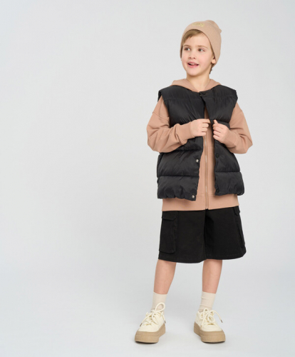 цветБежевыйверх:100% полиэстер; подкладка:100% полиэстер; утеплитель:100% полиэстер До +10°С Полиэстер Жилет детский утепленный молочный с капюшоном Button BlueСинтепон 100г/м2/ подкладка текстиль