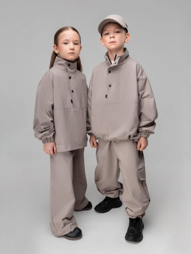 Артикул 32-88MU Состав 60% хлопок 40% полиэстер Материал курточная ткань Костюм: анорак и брюки. Свободная куртка без подклада на молнии с планкой на кнопках. Рукава с манжетой на резинке. По низу куртки имеется утяжка. Свободные, прямые брюки на поясе с внутренней резинкой. Брюки с двумя видами карман, боковые карманы и накладной карман по левому боковому шву закрытый клапаном, по низу брюк имеется дополнительная резинка с фиксатором для затяжки. Материал верха: курточная ткань 60% хлопок, 40% нейлон, плотность 155 г/кв.м.
