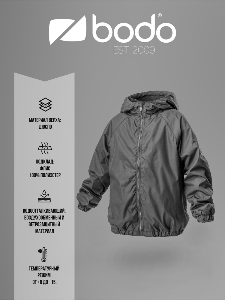 Материал Дюспо Состав 100% полиэстер Куртка с капюшоном для детей дошкольного возраста. Куртка на подкладке, свободного силуэта, с центральной застёжкой на молнию и карманами в боковых швах. Куртка с втачными рукавами с притачной манжетой. Куртка на поясе. Материал верха: Дюспо 100% полиэстер, подкладочный материал флис 100% полиэстер. Температурный режим: от +8 до +15 гр. зависимости от индивидуального теплообмена ребенка и промежуточного слоя одежды