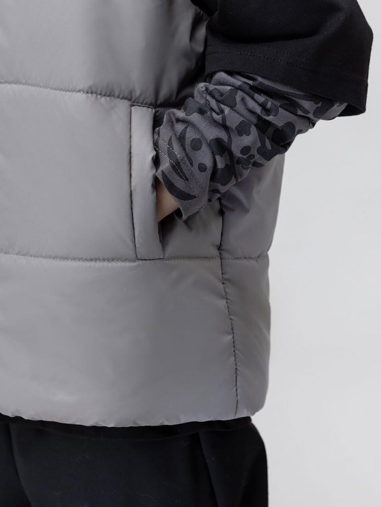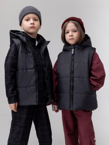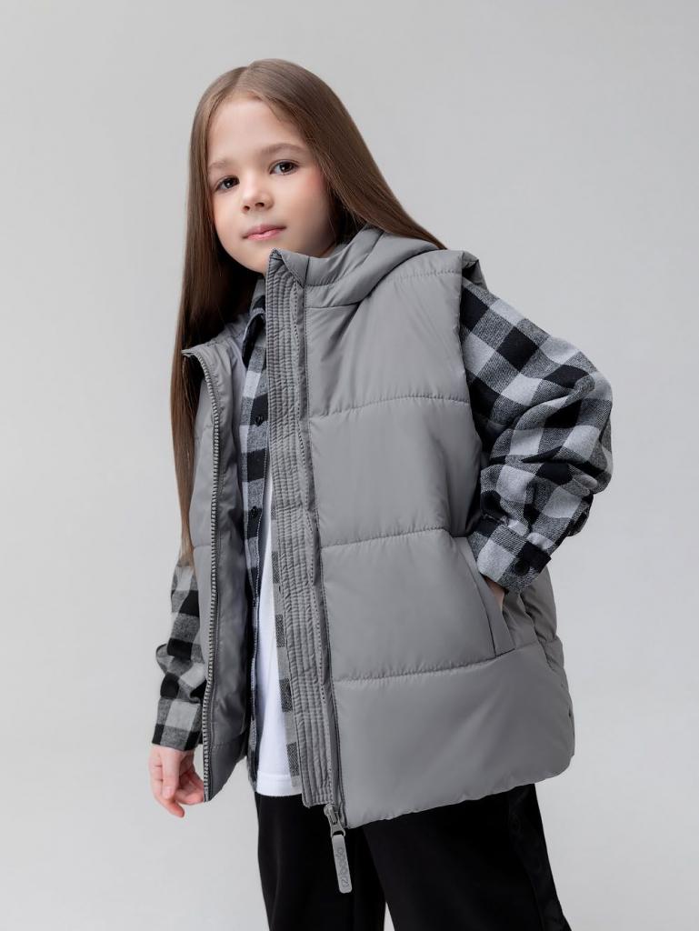 Артикул 14-90MU Состав 100% полиэстер Материал курточная ткань Прямой, утепленный жилет на молнии с капюшоном. Жилет на подкладке. На полочке расположены карманы. Материал верха: курточная ткань 100% полиэстер, плотность 67 г/м.кв., утеплитель 150 г/м.кв. Подкладочный материал кулирная гладь хлопок 100%