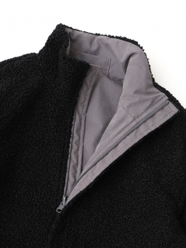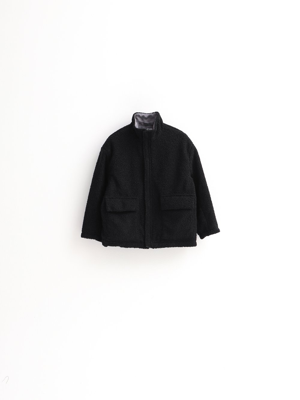 Объёмный двухсторонний бомбер: одна сторона из плащевки, другая - из искусственного коротковорсового меха. Застежка на молнию с перекидным бегунком, с ветрозащитным клапаном. На одной стороне – прорезные карманы, на меховой стороне – накладные. Утяжка по низу изделия. Воротник-стойка с карманом для петельки-вешалки на спине.