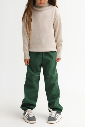 Брюки свободного кроя, прямого силуэта. Пояс на мягкой резинке, дополнительно регулируется шнуровой резинкой с фиксатором. Анатомическая вытачка  в области колен. Низ брюк оформлен манжетами на резинке. Световозвращающие элементы.Примерный температурный режим от -5°С до +18°С.