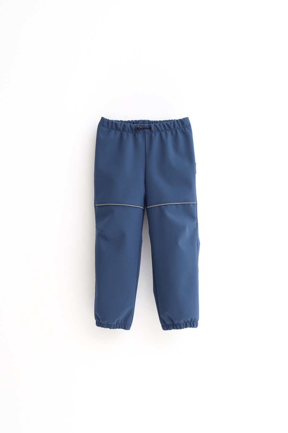 Брюки свободного кроя, прямого силуэта. Пояс на мягкой резинке, дополнительно регулируется шнуровой резинкой с фиксатором. Анатомическая вытачка  в области колен. Низ брюк оформлен манжетами на резинке. Световозвращающие элементы.