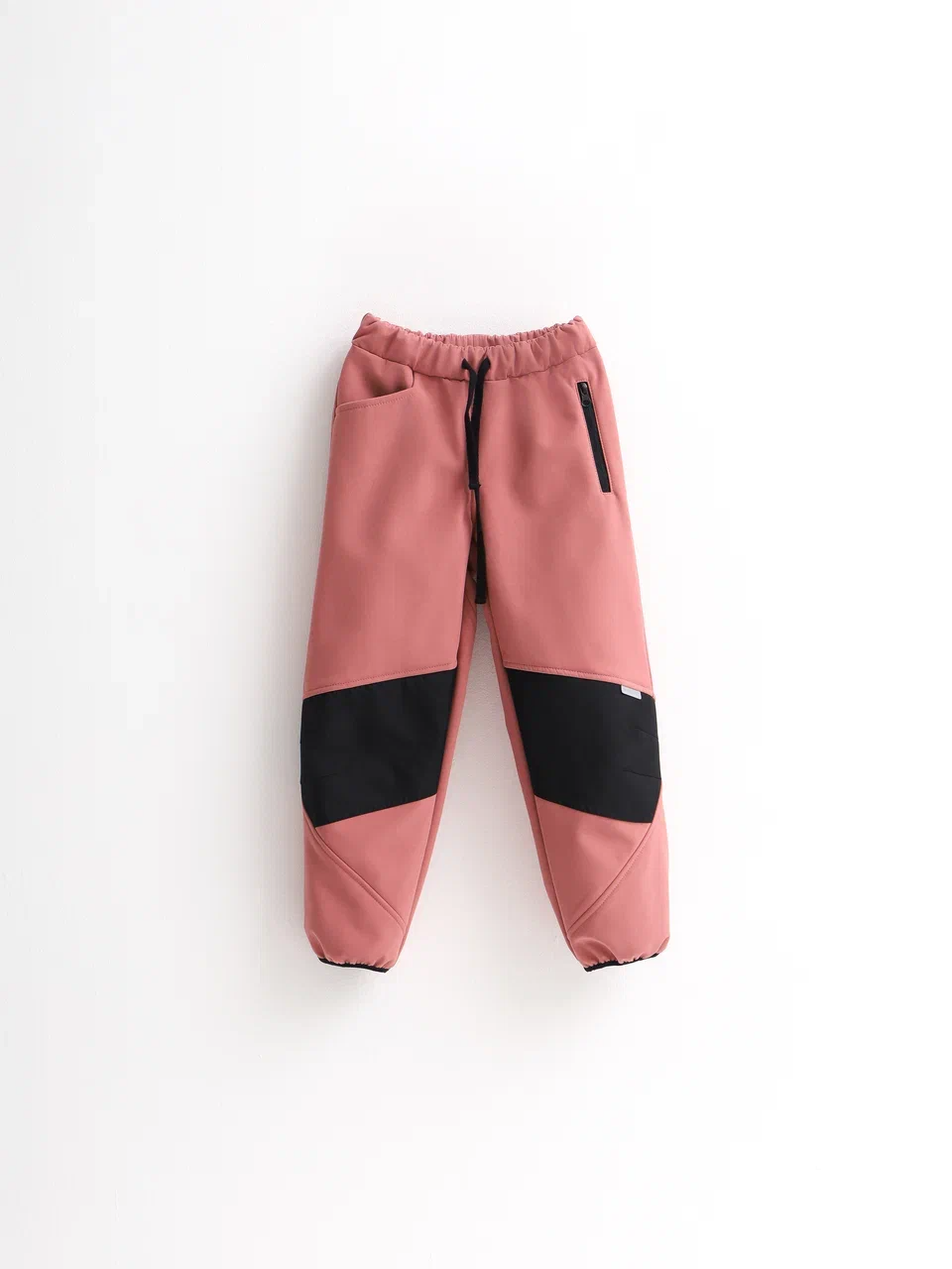 Брюки с двумя карманами: один на молнии и второй с фигурным входом, с утяжкой по поясу и усилением на коленях из прочной ткани.