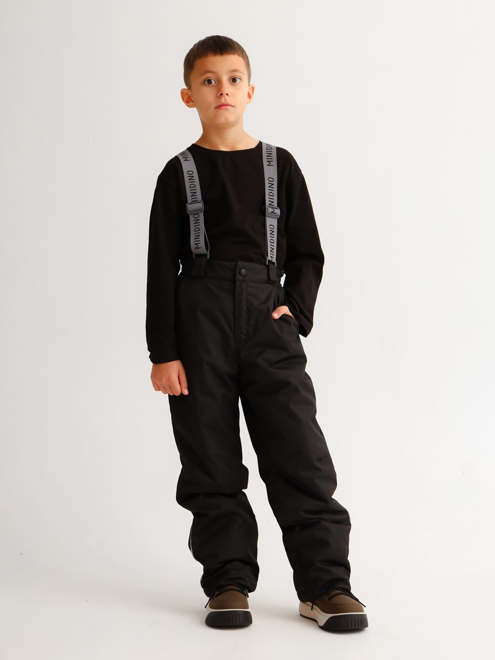 Брюки умеренного объема. Пояс с застежкой на молнию и кнопку, часть пояса по спинке - со сборкой на резинку, с внутренней частью (к телу) из мягкого полибрушета. Отстежные лямки на шлевках на липучке с наружней части пояса. Штанины с широкой обтачкой низа для возможности подворота и внутренней муфтой
