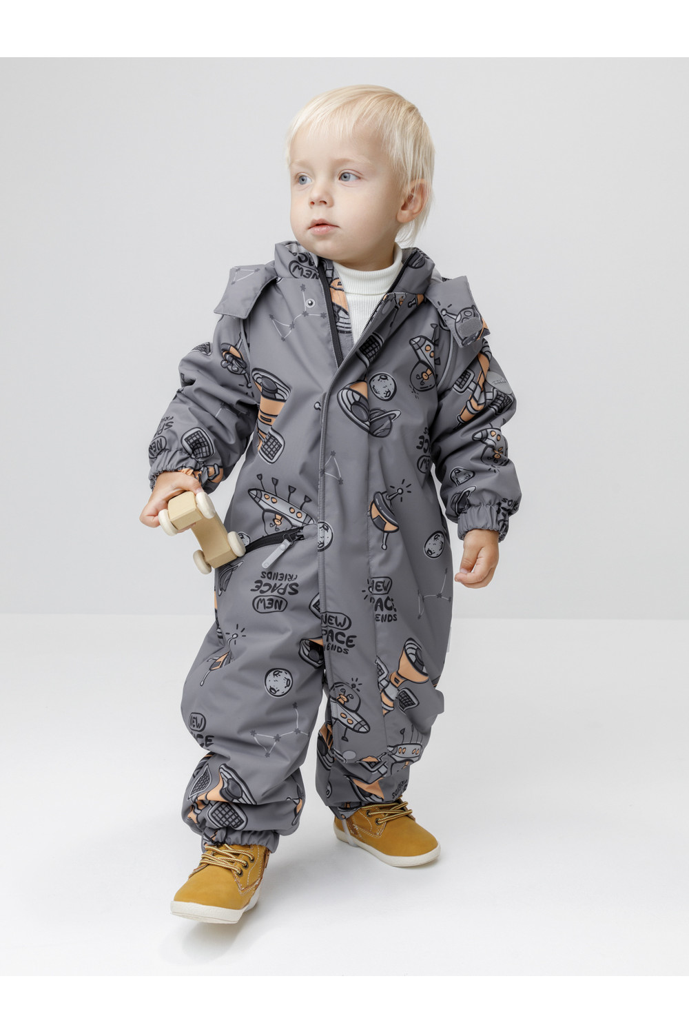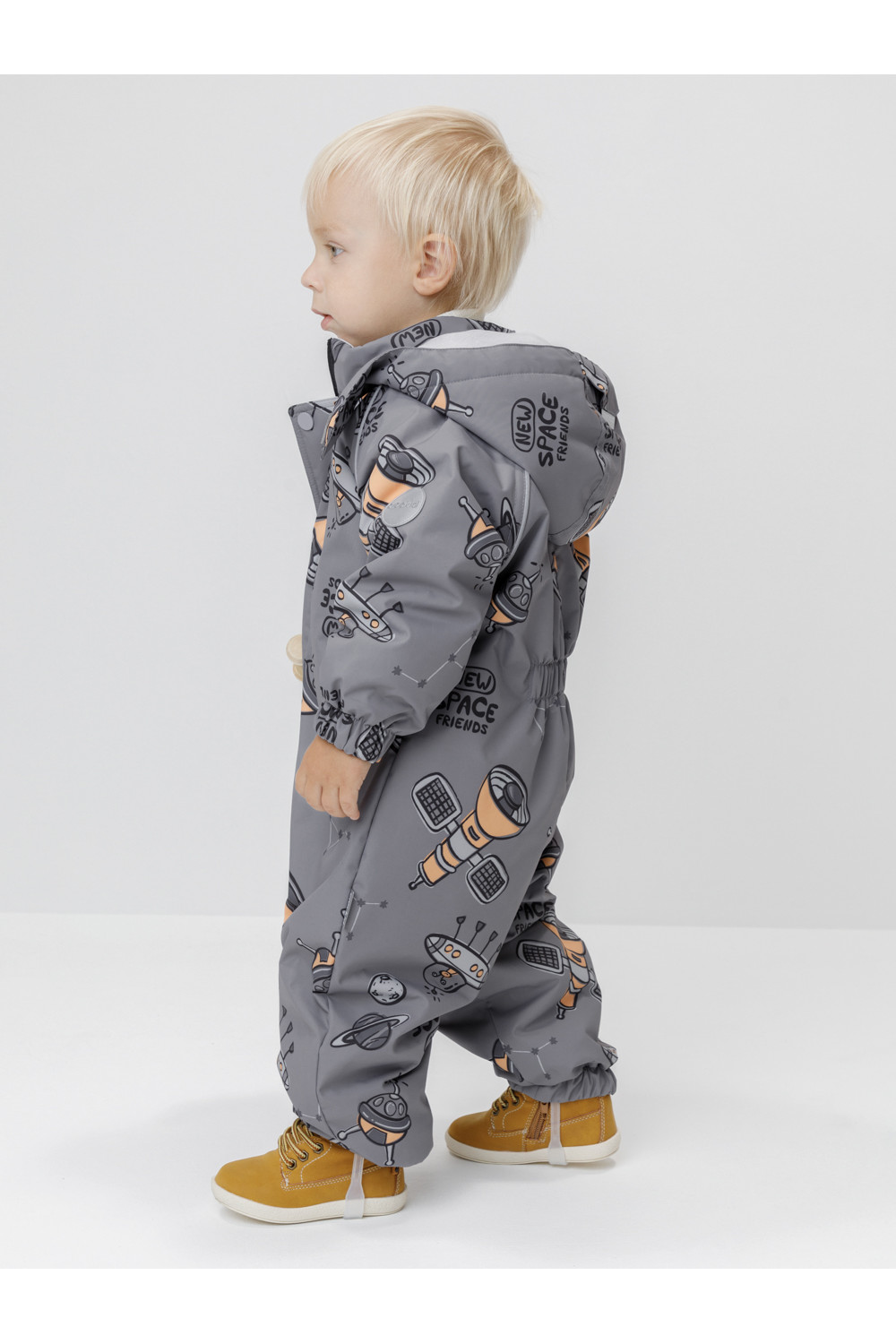 Демисезонный комбинезон ясельный с утеплителем Fellex®, 120 г/м2. Выполнен из мембранной ткани с дополнительной тефлоновой обработкой. Данный вид обработки предохраняет изделие от загрязнения и лучше отводит влагу. Подклад из 100% хлопка. Для удобного одевания комбинезон застёгивается на удлинённую молнию с защитой подбородка. Ветрозащитная планка фиксируется на липучках и кнопках. Утяжка на капюшоне с потайным стоппером. По низу рукавов и брючин, а также на спинке изделия предусмотрены эластичные резинки для лучшего прилегания. Для фиксации комбинезона используются съёмные силиконовые штрипки. В размере 74-80 есть функциональные отвороты на рукавах и брючинах. Во всех изделиях верхнего ассортимента для безопасности ребёнка предусмотрены светоотражающие элементы.