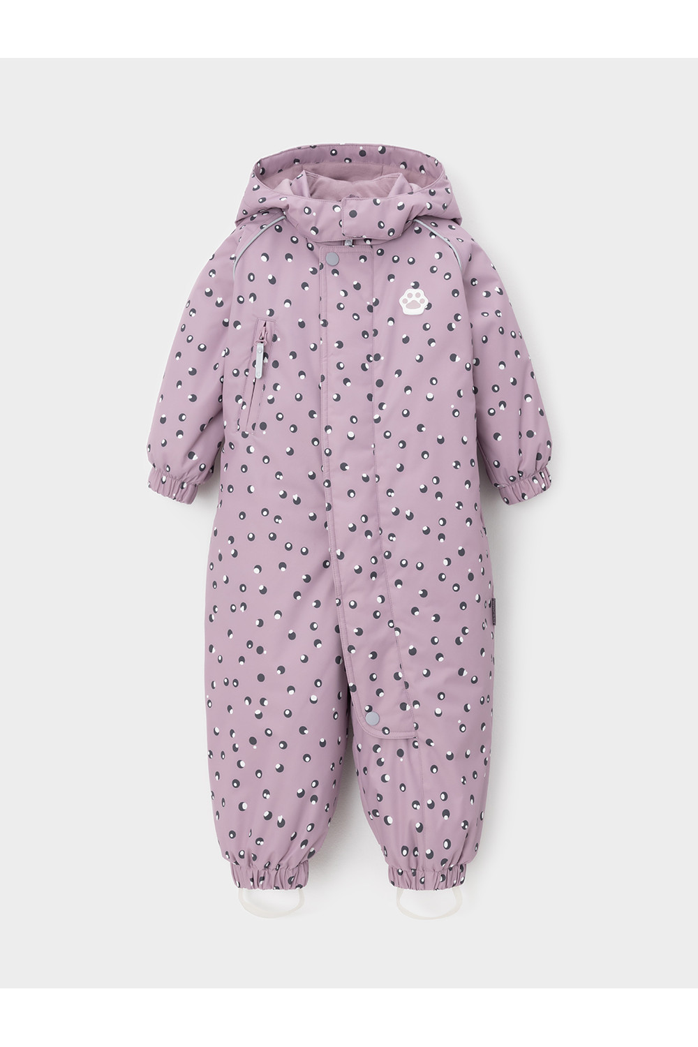 Демисезонный комбинезон ясельный с утеплителем SEE, 120 г/м2. Выполнен из мембранной ткани с дополнительной тефлоновой обработкой. Данный вид обработки предохраняет изделие от загрязнения и лучше отводит влагу. Подклад из 100% хлопка. Для удобного одевания комбинезон застёгивается на удлинённую молнию с защитой подбородка. Ветрозащитная планка фиксируется на липучках и кнопках. Утяжка на капюшоне с потайным стоппером. По низу рукавов и брючин, а также на спинке изделия предусмотрены эластичные резинки для лучшего прилегания. Для фиксации комбинезона используются съёмные силиконовые штрипки. В размерах 68-74 и 74-80 есть функциональные отвороты на рукавах и брючинах. Во всех изделиях верхнего ассортимента для безопасности ребёнка предусмотрены светоотражающие элементы.