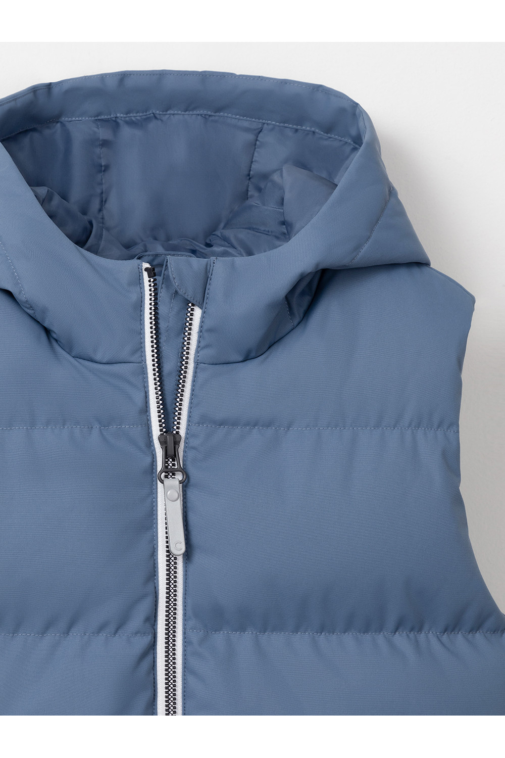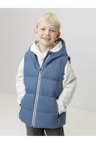 Стёганый жилет с капюшоном для мальчика с утеплителем, 120 г/м2. Выполнен из мембранной ткани с дополнительной тефлоновой обработкой. Данный вид обработки предохраняет изделие от загрязнения и лучше отводит влагу. Подклад из 100% полиэстра. Капюшон не снимается. Изделие застёгивается на молнию, предусмотрена защита подбородка. Два кармана по бокам застёгиваются на молнии. Во всех изделиях верхнего ассортимента для безопасности ребёнка предусмотрены светоотражающие элементы.