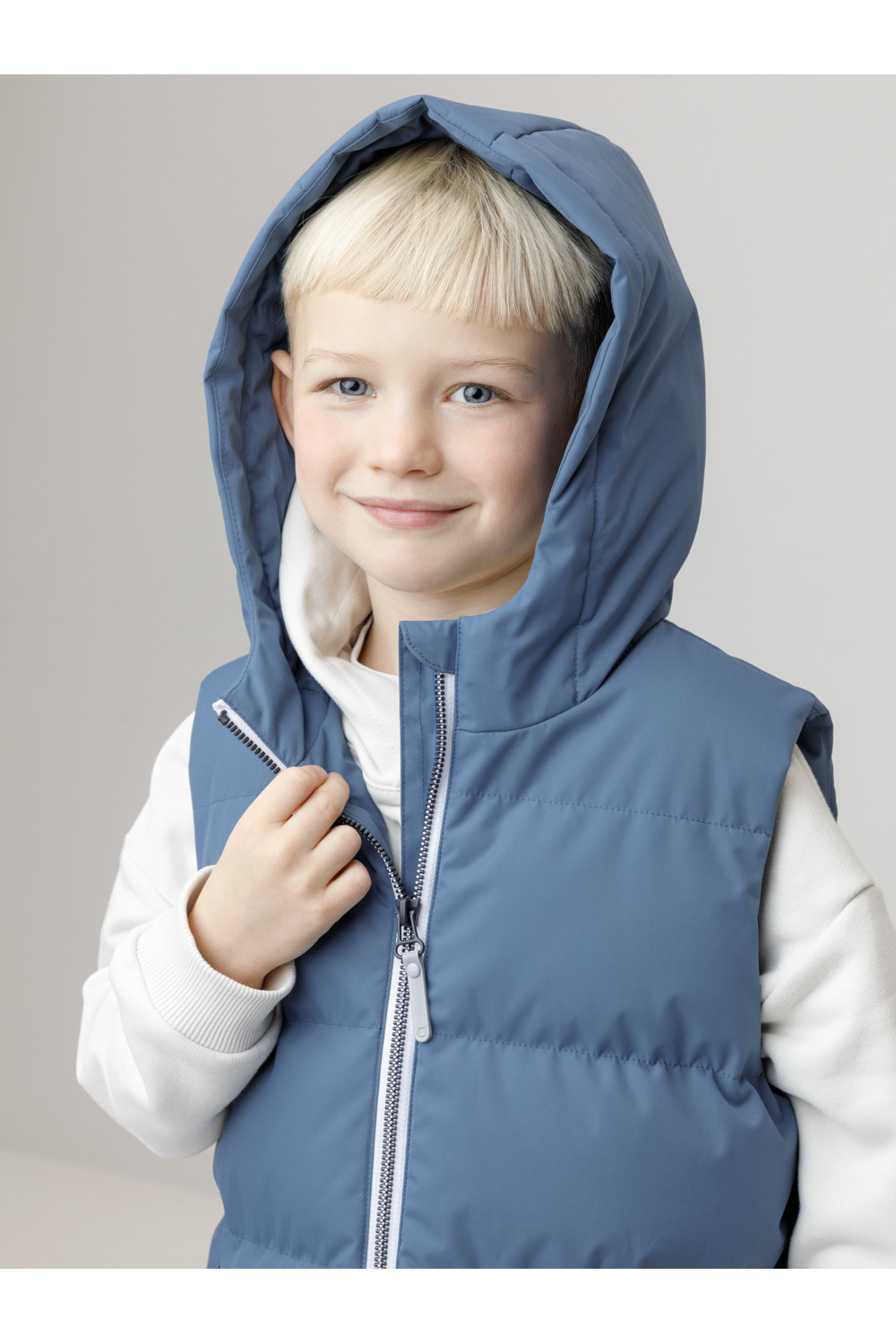 Стёганый жилет с капюшоном для мальчика с утеплителем синтепух, 120 г/м2. Выполнен из мембранной ткани с дополнительной тефлоновой обработкой. Данный вид обработки предохраняет изделие от загрязнения и лучше отводит влагу. Подклад из 100% полиэстра. Капюшон не снимается. Изделие застёгивается на молнию, предусмотрена защита подбородка. Два кармана по бокам застёгиваются на молнии. Во всех изделиях верхнего ассортимента для безопасности ребёнка предусмотрены светоотражающие элементы.