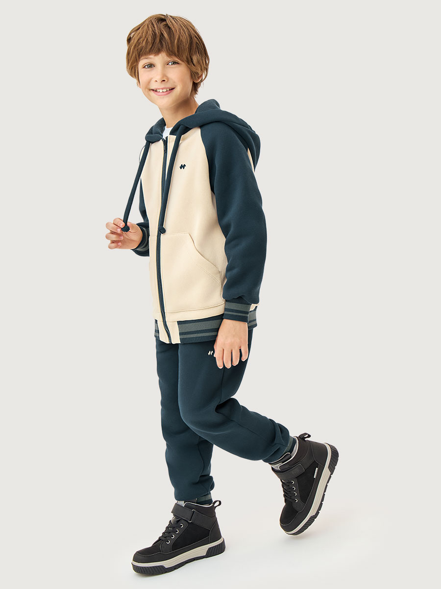 Костюм КОЛЛЕДЖ из плотного хлопкового трикотажа с мягким стриженным начесом внутри. Состоит из двух предметов — толстовки и брюк. Толстовка свободного силуэта, на молнии, с капюшоном, с карманами «кенгуру». Манжеты и пояс из трикотажного полотна «кашкорсе».