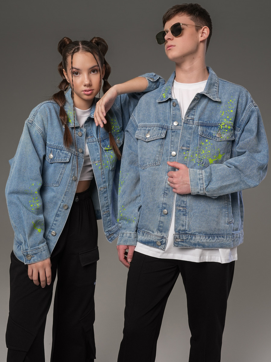 Джинсовая куртка из экологического хлопка для теплой весны или прохладного лета, украшенная износостойким принтом. Полочка и спинка на кокетке, отложной воротник, на полочке два накладных кармана с клапанами и два боковых кармана с листочкой. Втачные рукава с манжетами застегиваются на пуговицу, манжета по низу изделия. Застежка на пуговицы с фирменным логотипом. Вся наша продукция сертифицирована и соответствует высочайшим стандартам качества, наша компания является участником программы "Бережливое производство" голубой