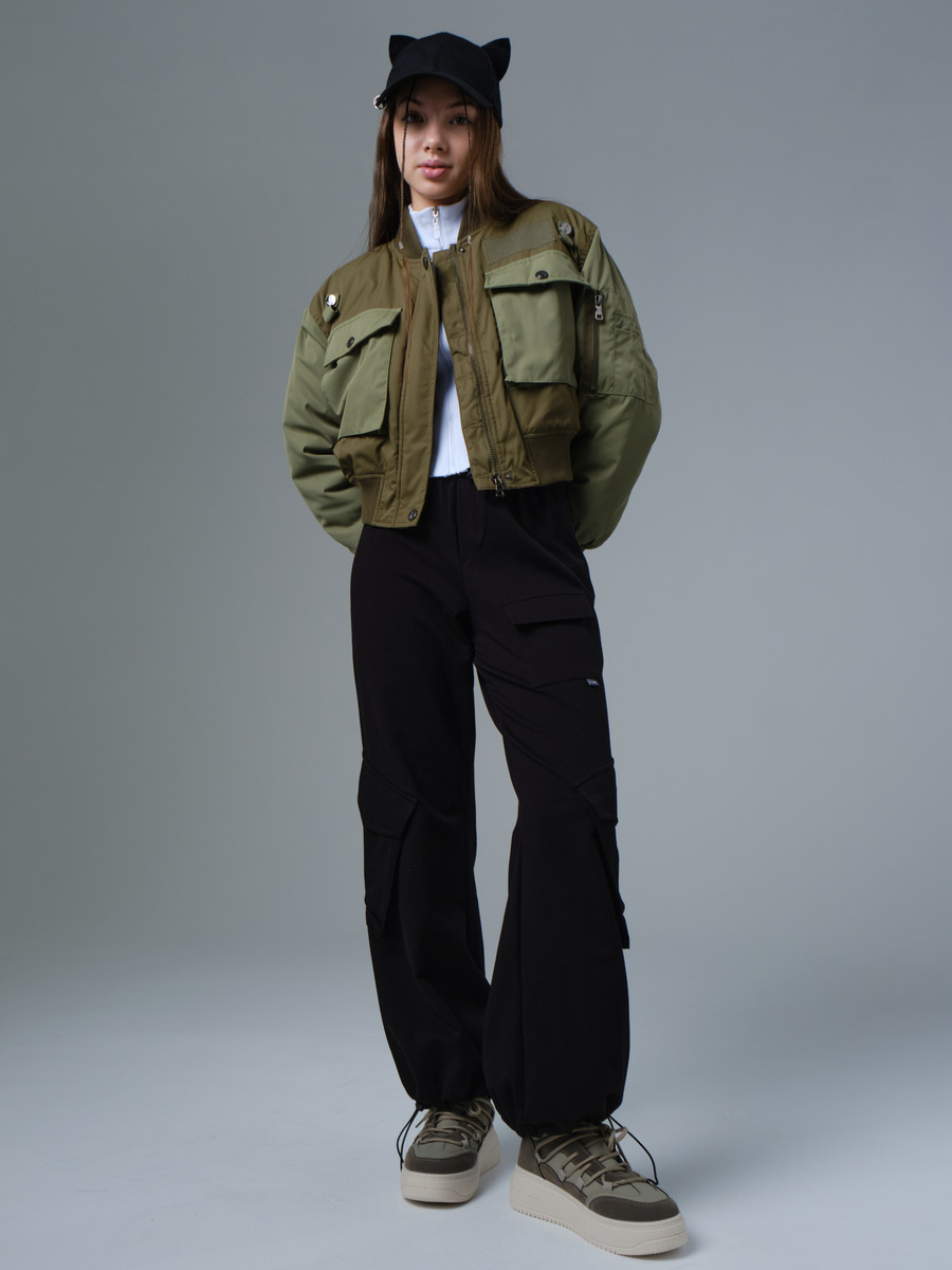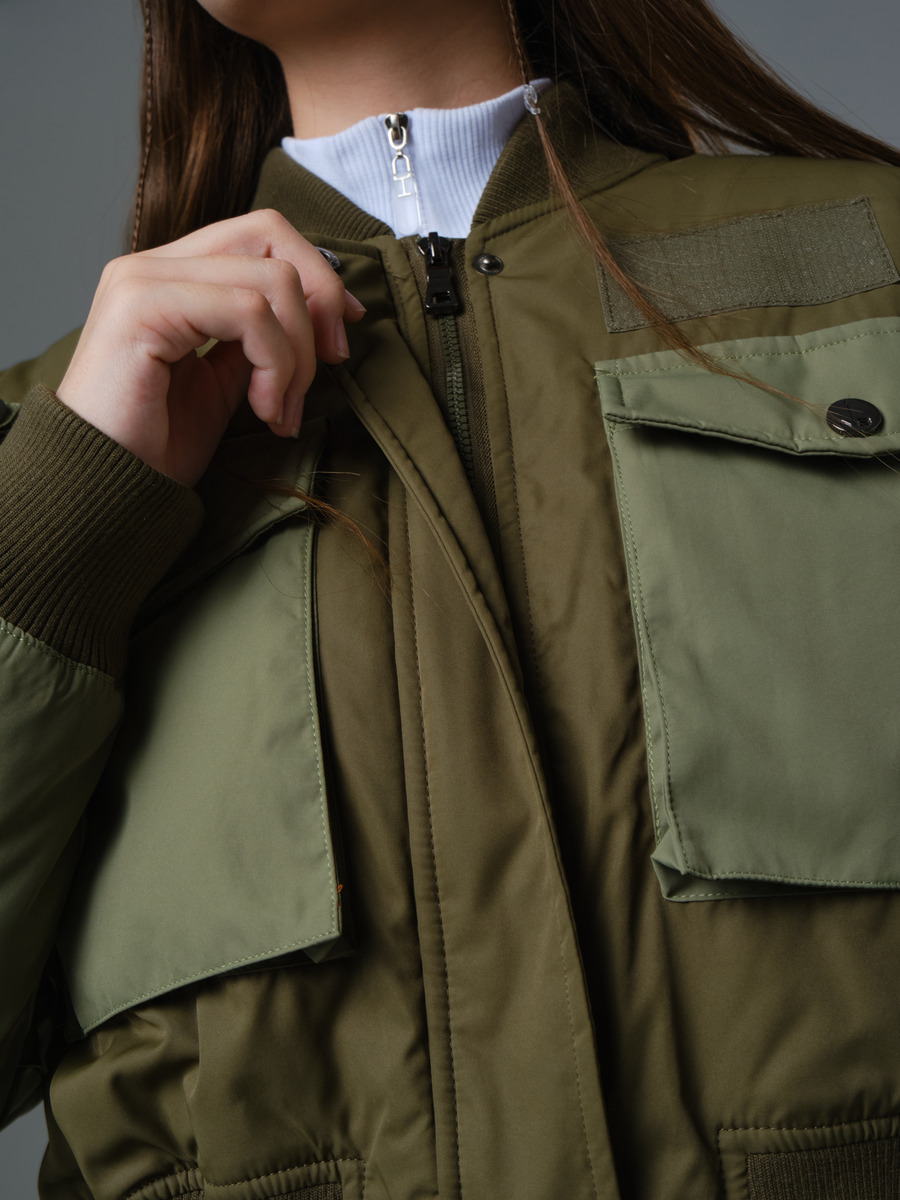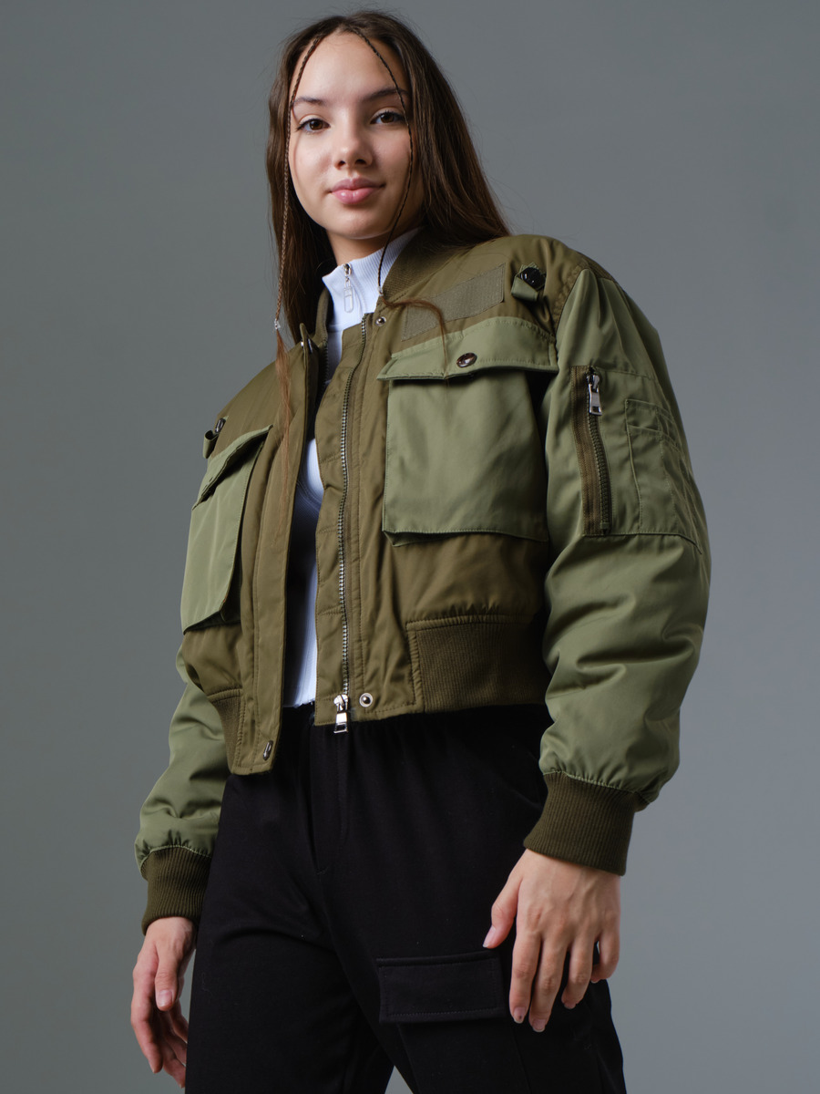 Стильная укороченная куртка-бомбер свободного силуэта на подкладе с утеплителем с трикотажным воротником-стойкой и контрастными по цвету рукавами и карманами. Застежка на молнию, защищена планкой от ветра, планка фиксируется копками. Низ куртки и низ рукавов собран на резинку. На полочке накладные карманы с клапаном имеют дополнительную боковую прорезь для рук. Клапаны застегиваются на кнопки. Над карманами расположена декоративная нашивка и декоративные элементы в виде петли с кнопками. На левом рукаве оригинальный накладной карман на молнии с нашивкой для мелочи. Подходит как на весну, так и на осень для температуры до 0 градусов, устойчива к попаданию влаги. Вся наша продукция сертифицирована и соответствует высочайшим стандартам качества, наша компания является участником программы "Бережливое производство"