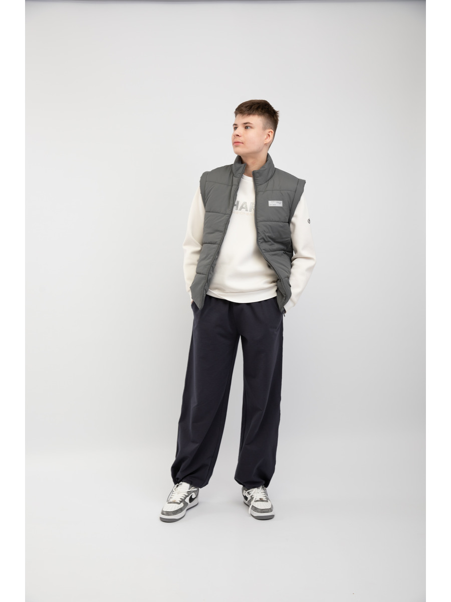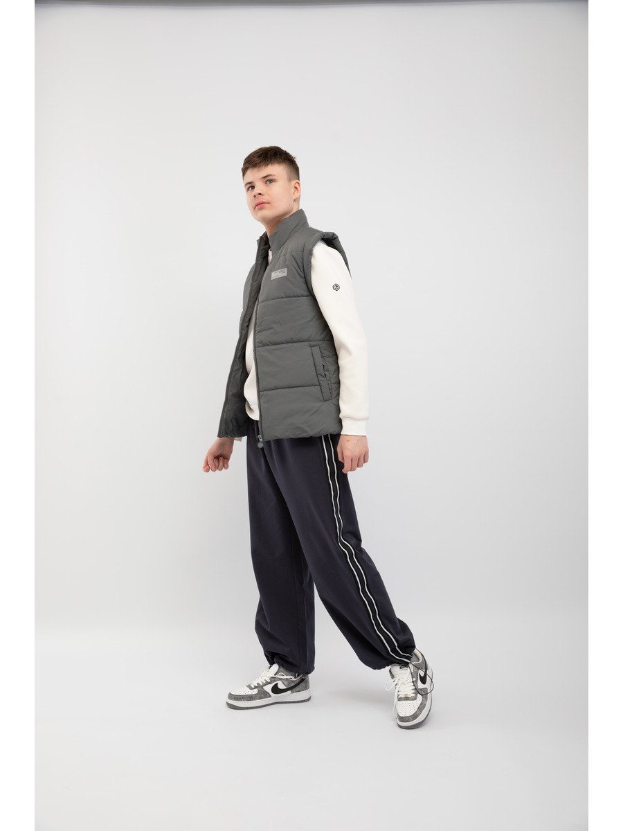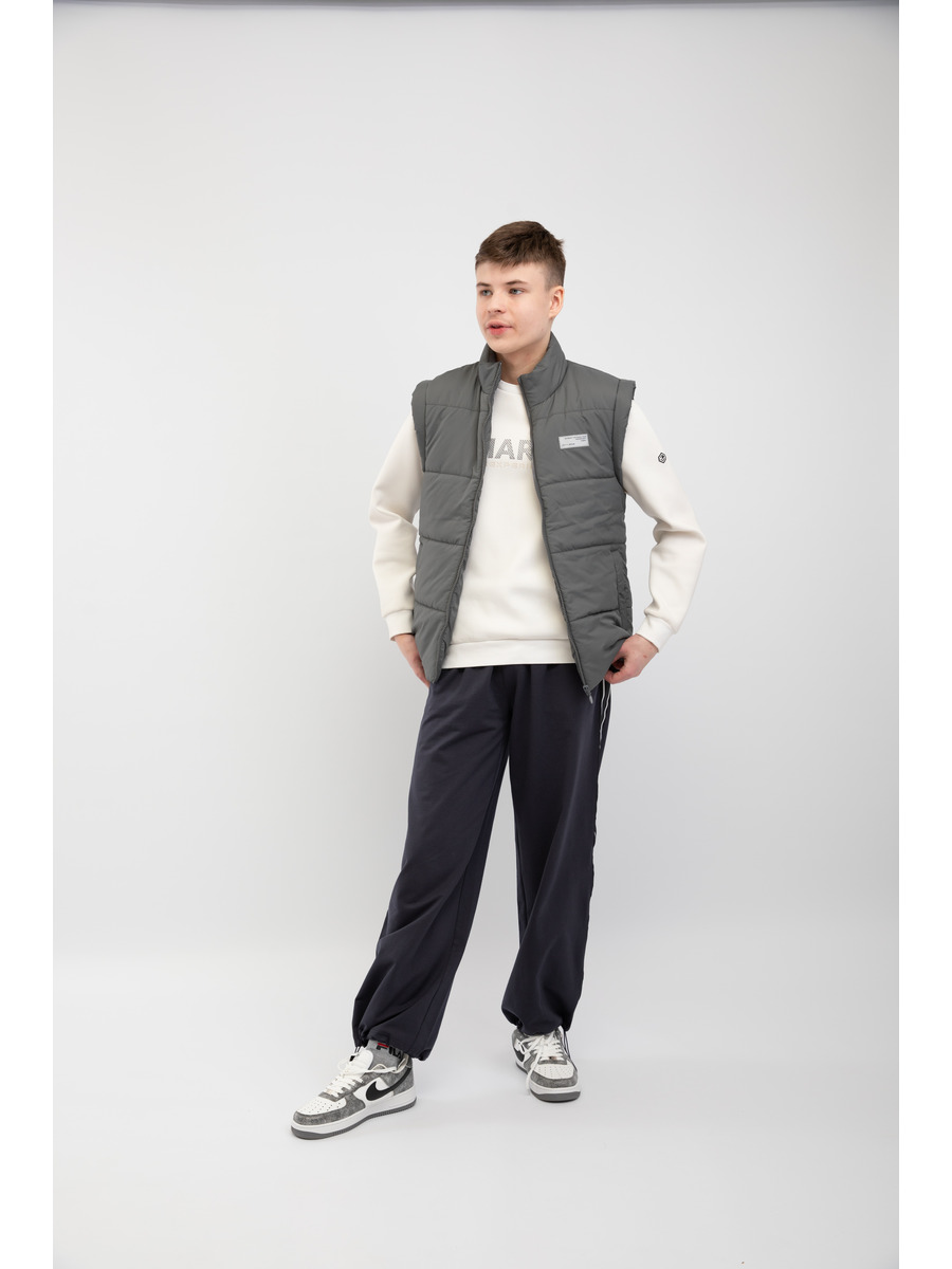 Утепленный демисезонный стеганый жилет свободного прямого силуэта. Воротник-стойка с трикотажной основой надежно защищает от ветра. На полочке светоотражающая нашивка с фирменным логотипом, по низу спинки светоотражающая надпись. Застежка центральная на молнии с ветрозащитной планкой, на круглом пуллере застежки-молнии фирменный логотип. Два удобных боковых кармана с листочкой. Вся наша продукция сертифицирована и соответствует высочайшим стандартам качества, наша компания является участником программы "Бережливое производство"
