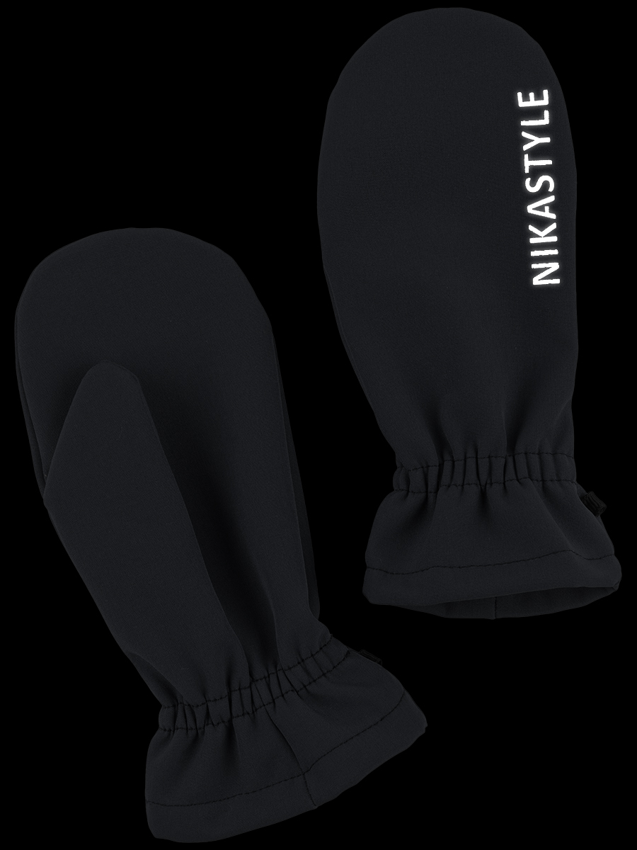 Варежки из Softshell с резинкой на запястье. Softshell - это инновационный материал нового поколения, внешний слой которого защищает от влаги, внутренний слой из флиса сохраняет тепло и отводит лишнюю влагу, а промежуточный мембранный слой имеет хорошую паропроницаемость и позволяет коже дышать. Softshell приятный на ощупь, легкий и эластичный материал, не сковывающий движения ребенка.